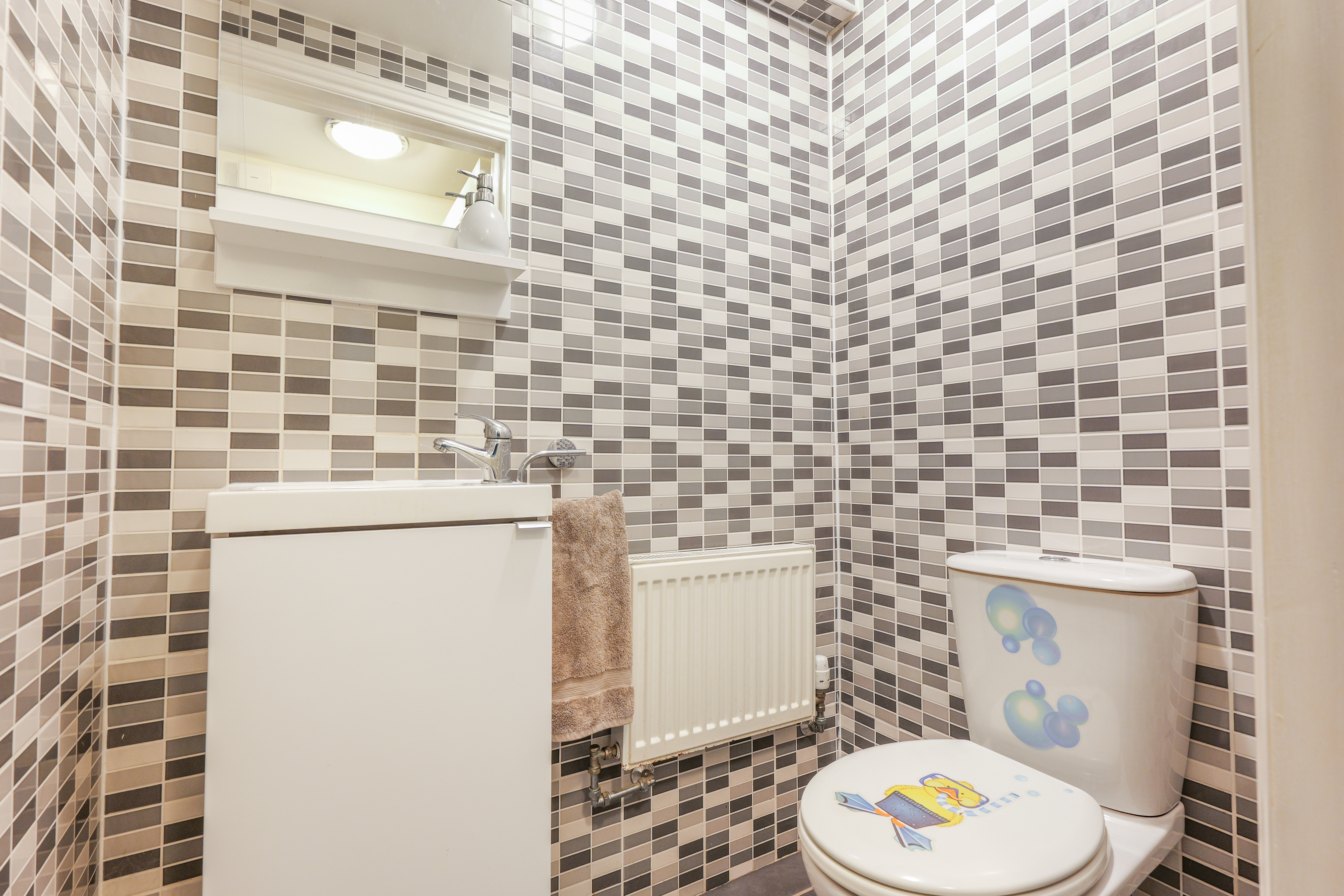 The lower level Wc features a square set wash-hand basin integrated within modern vanity unit and Wc both complemented by stylish wall tiles for a contemporary finish.