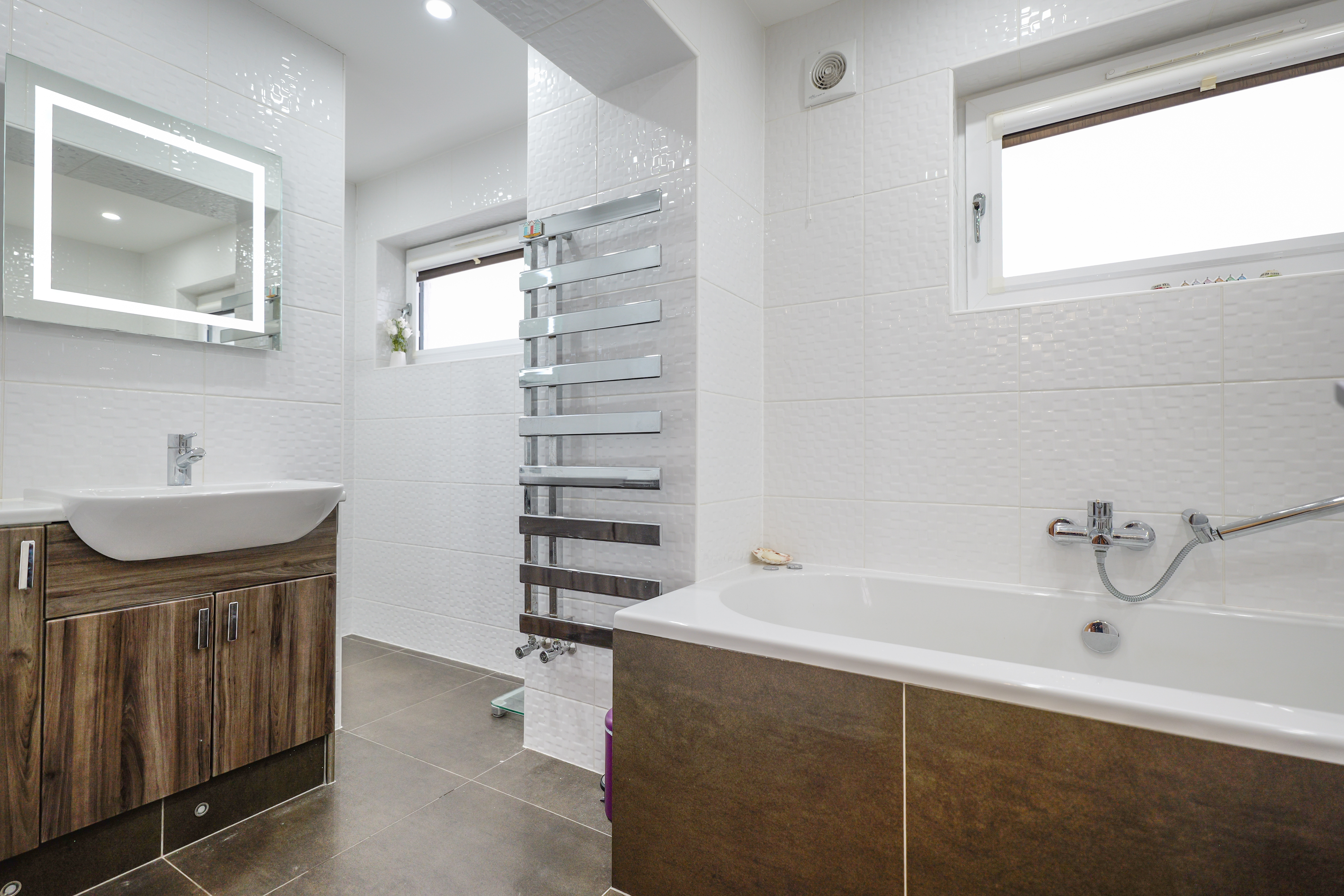 The chic contemporary designed four-piece bathroom exudes sophistication, offering a relaxing sanctuary to unwind in.