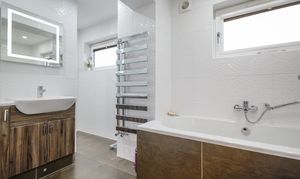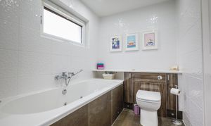 This exquisite four piece bathroom suite combines style, functionality and modern elegance. Featuring a pristine white bath, wash-hand basin set within stylish vanity unit complemented by the Wc set within matching storage unit offering both practicality and a streamlined look. A separate, secluded shower enclosure features rain-water shower head and offers a recessed shelf perfect for accommodating toiletries. High gloss dark floor tiling contrast beautifully with the crisp white wall tiling whilst recessed spotlights add a contemporary finishing touch, highlighting the room's clean lines and sophisticated design.