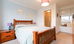 Beautifully presented in soft pastel tones, the spacious primary bedroom exudes a calm and inviting atmosphere. A stylish feature wallpaper adds a touch of elegance, complemented by neutral carpeting The room provides ample space for freestanding furniture and also offers sleek modern double fitted wardrobes.