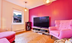 Fabulous and spacious family room featuring elegant solid wood flooring laid in a classic herringbone design. The room enjoys excellent natural light with bi-folding doors offering seamless access to the garden, complemented by dual aspect windows that enhance the bright and airy feel. Beautifully decorated in soothing natural tones with bold feature accent wall adding a contemporary touch to this inviting living area.