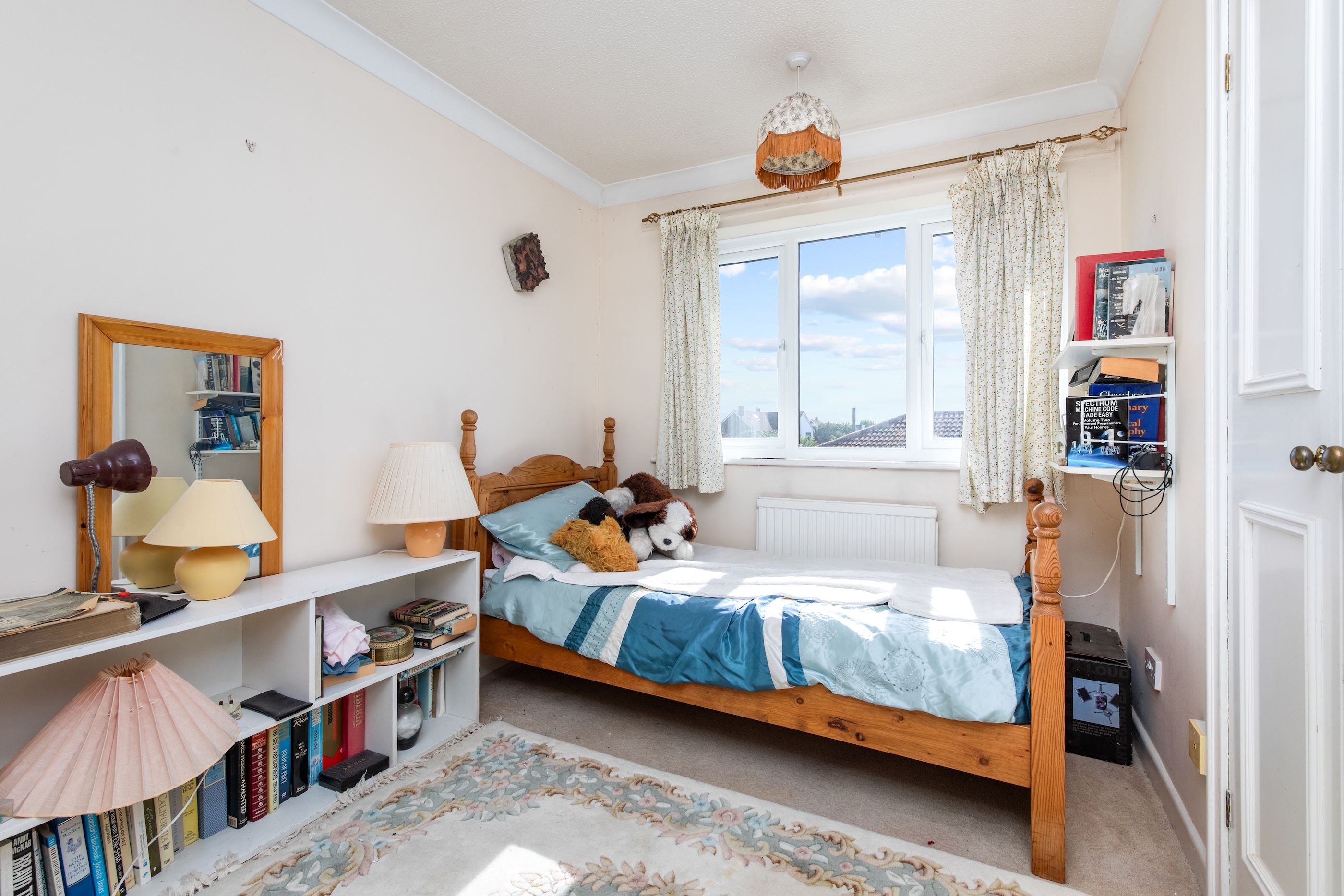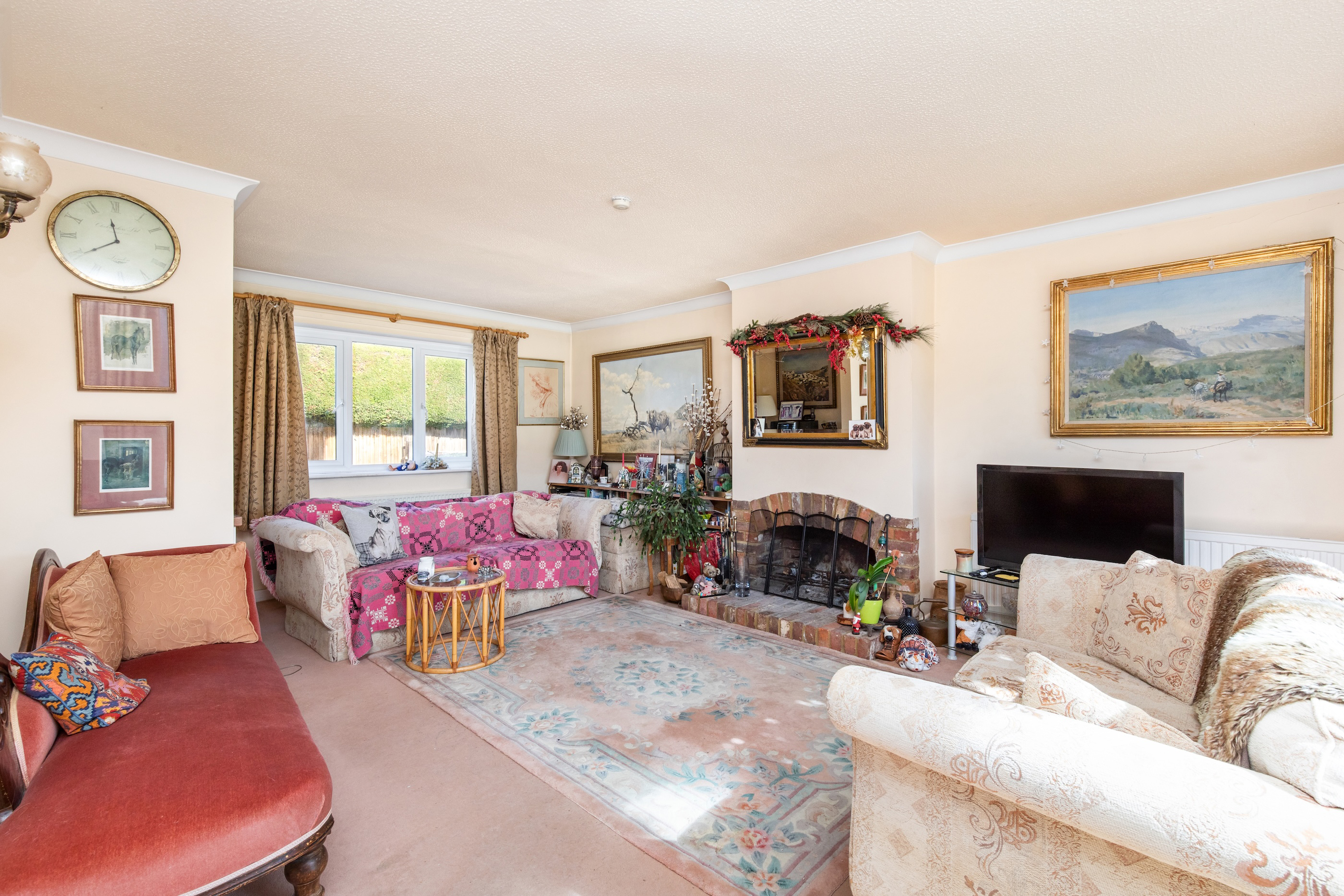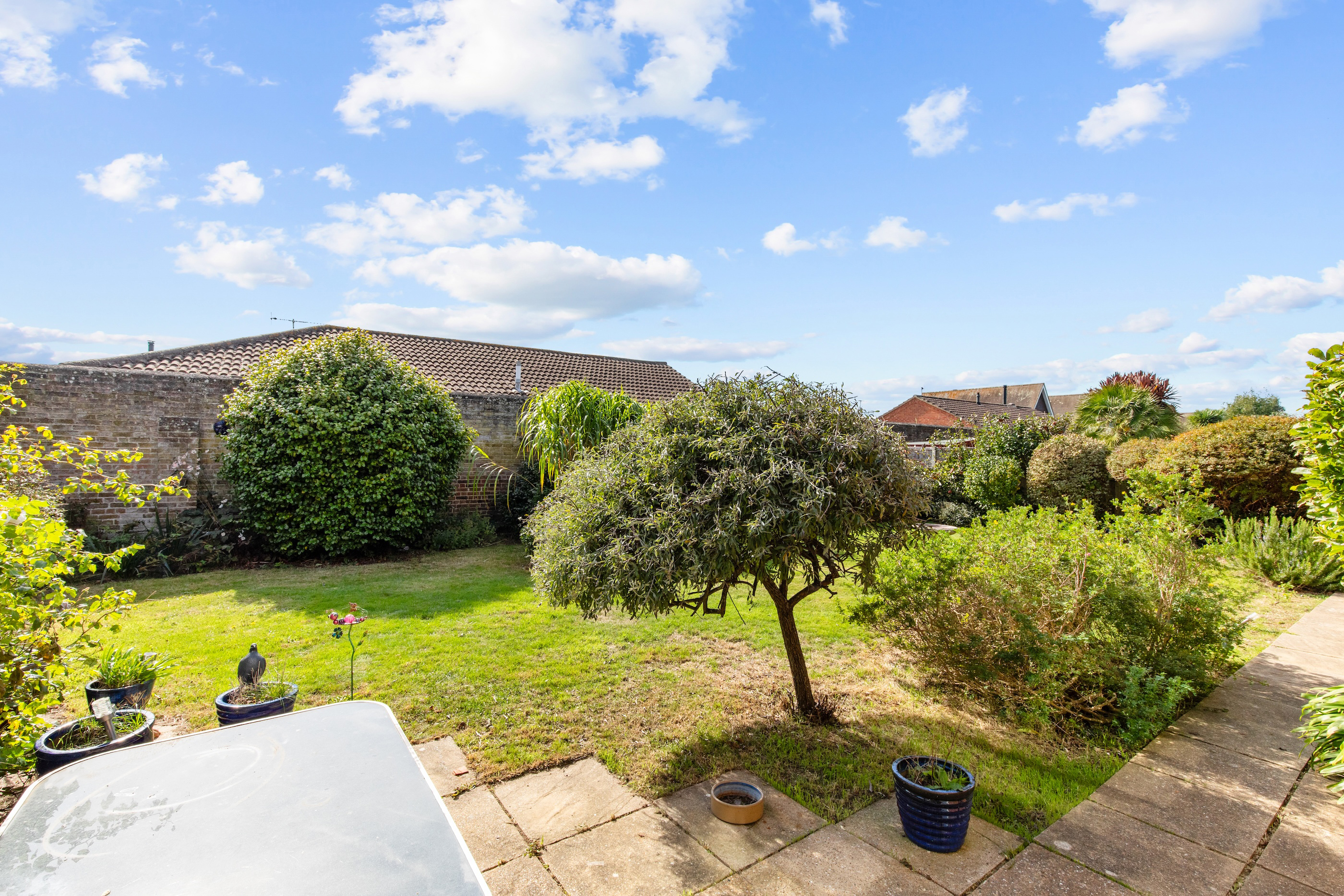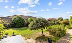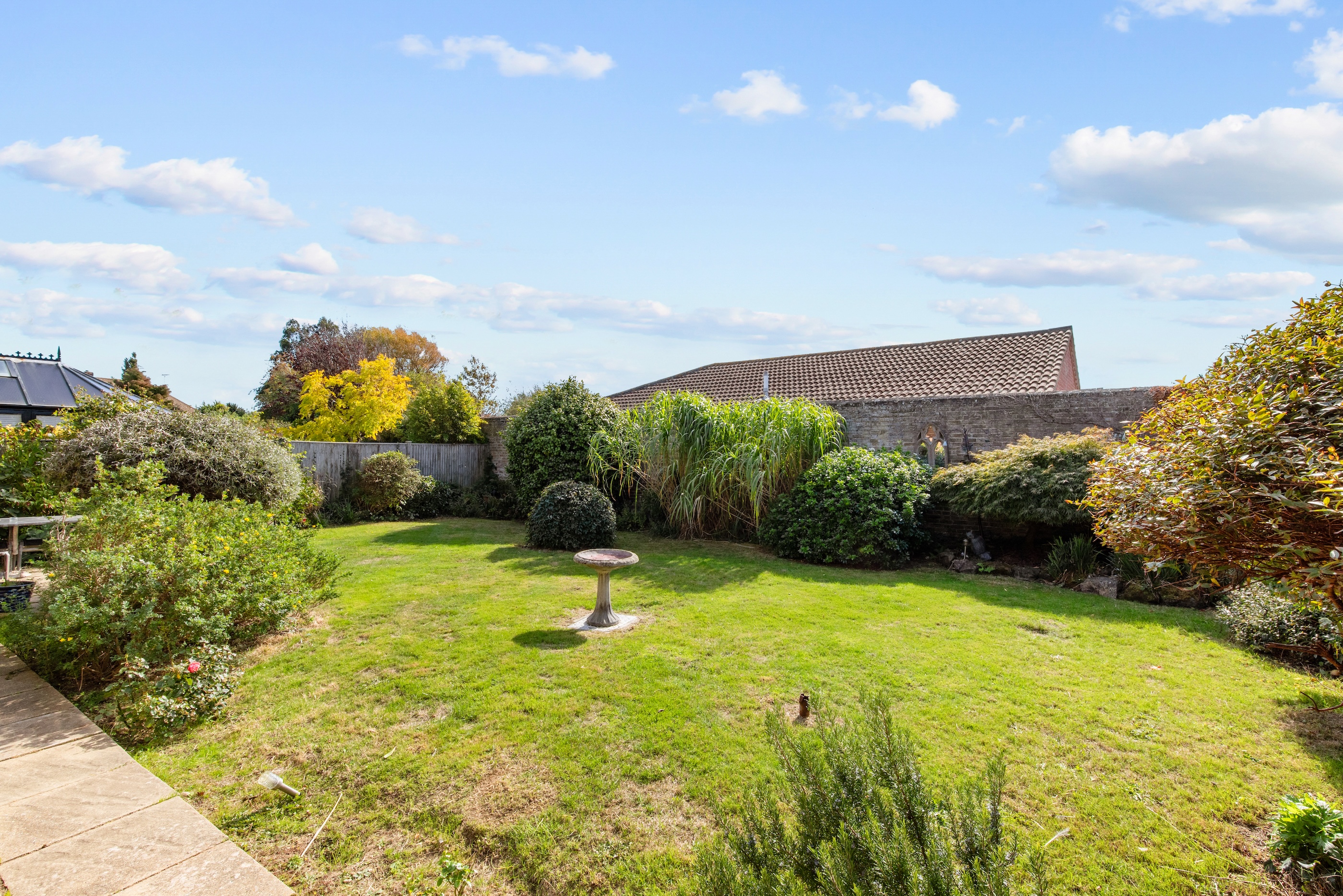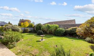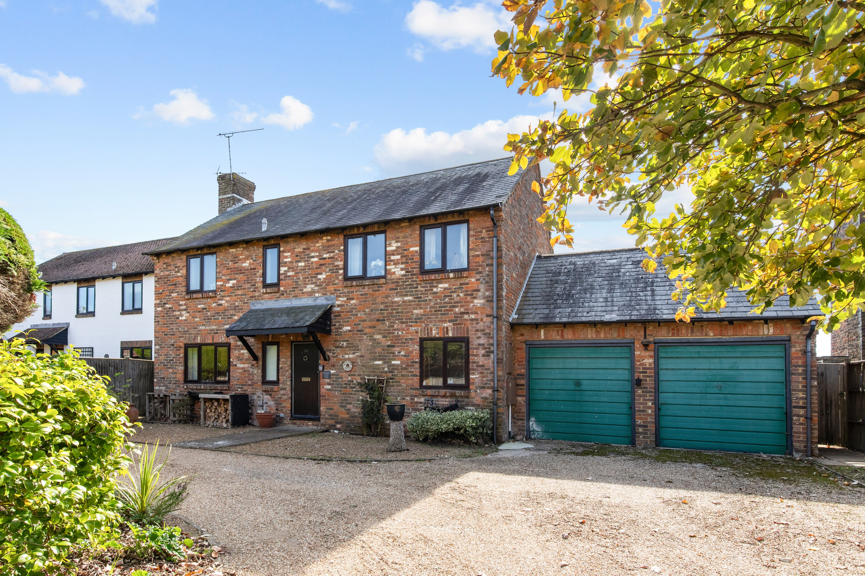 Outside, the walled south-facing garden provides complete privacy and features mature planting throughout. To the front, a gravelled driveway offers ample parking and leads to the double garage.