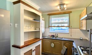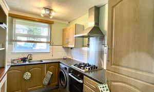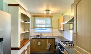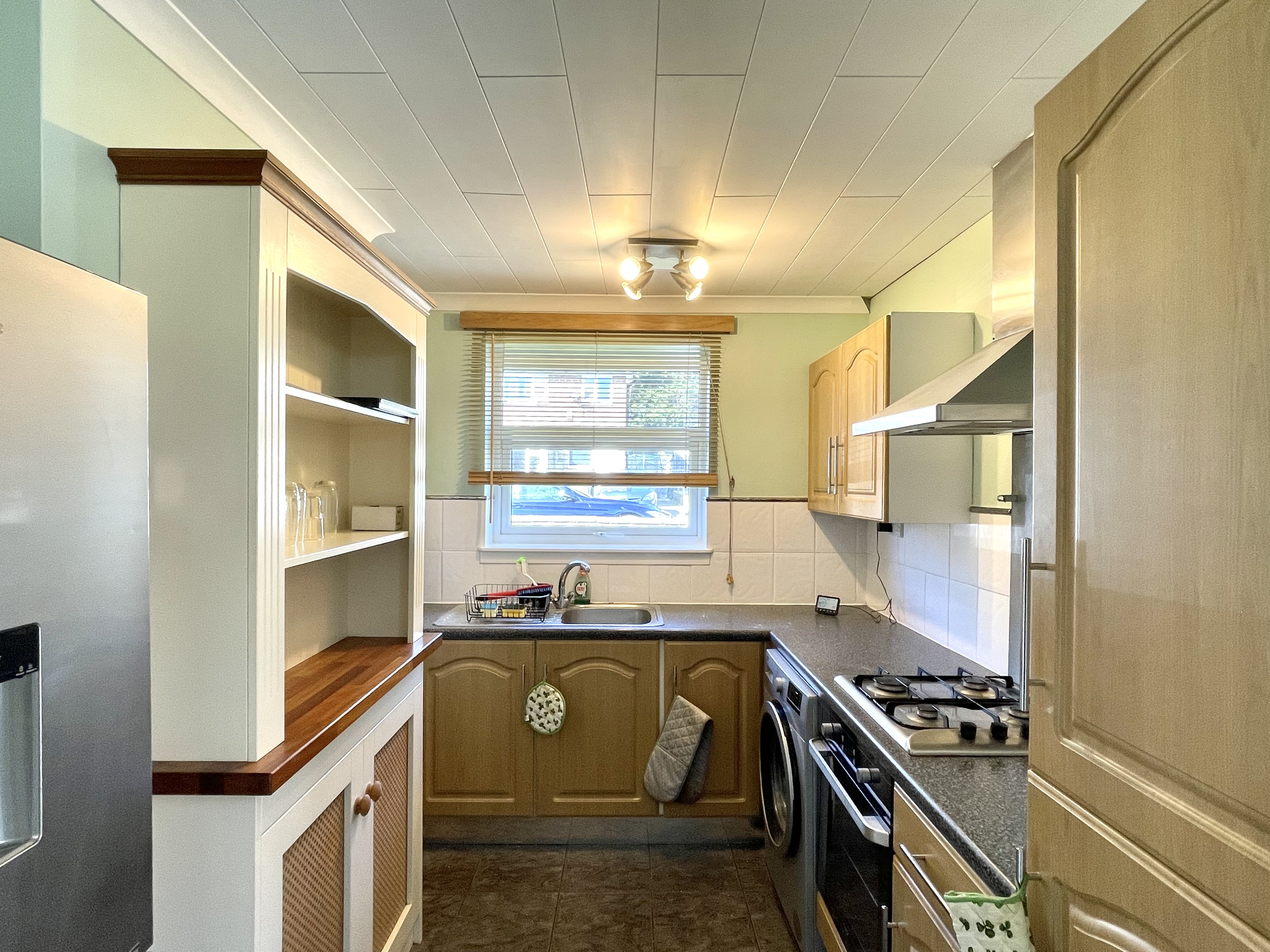 With composite panelled and frosted double glazed entrance door, there is a recently fitted pVCU double glazed window, ceiling light point, ceiling coving, wall mounted Baxi gas fired central heating boiler, tiled floor, range of base and wall cupboards, drawers, contrasting overlying worktops with tiled splash back, inset single drainer stainless sink with chrome mixer tap, four ring stainless steel gas hob with stainless steel extractor hood over and electric oven beneath, plumbing for automatic washing machine and dresser unit with display shelving and cupboard concealing a central heating radiator.