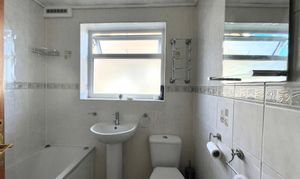 With frosted pvcu double glazed window, ceiling light point, floor to ceiling tiled walls, tiled floor, central heating radiator and fitted with a suite comprising pedestal wash basin with chrome monobloc tap, low flush WC and panelled Jacuzzi style bath with glazed side panel and chrome shower fitting over.