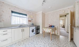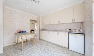 Upon entering, there is a spacious hallway. Immediately to your right is a living area with feature fireplace providing a comfortable setting for relaxation and entertaining. To the rear of the property the kitchen/breakfast room is the ideal space for preparing and enjoying meals. The kitchen is well-equipped, featuring ample cream-colored wall and base units. It offers space for a freestanding cooker, an under-counter fridge, and a washing machine, with additional room to accommodate a dining table.