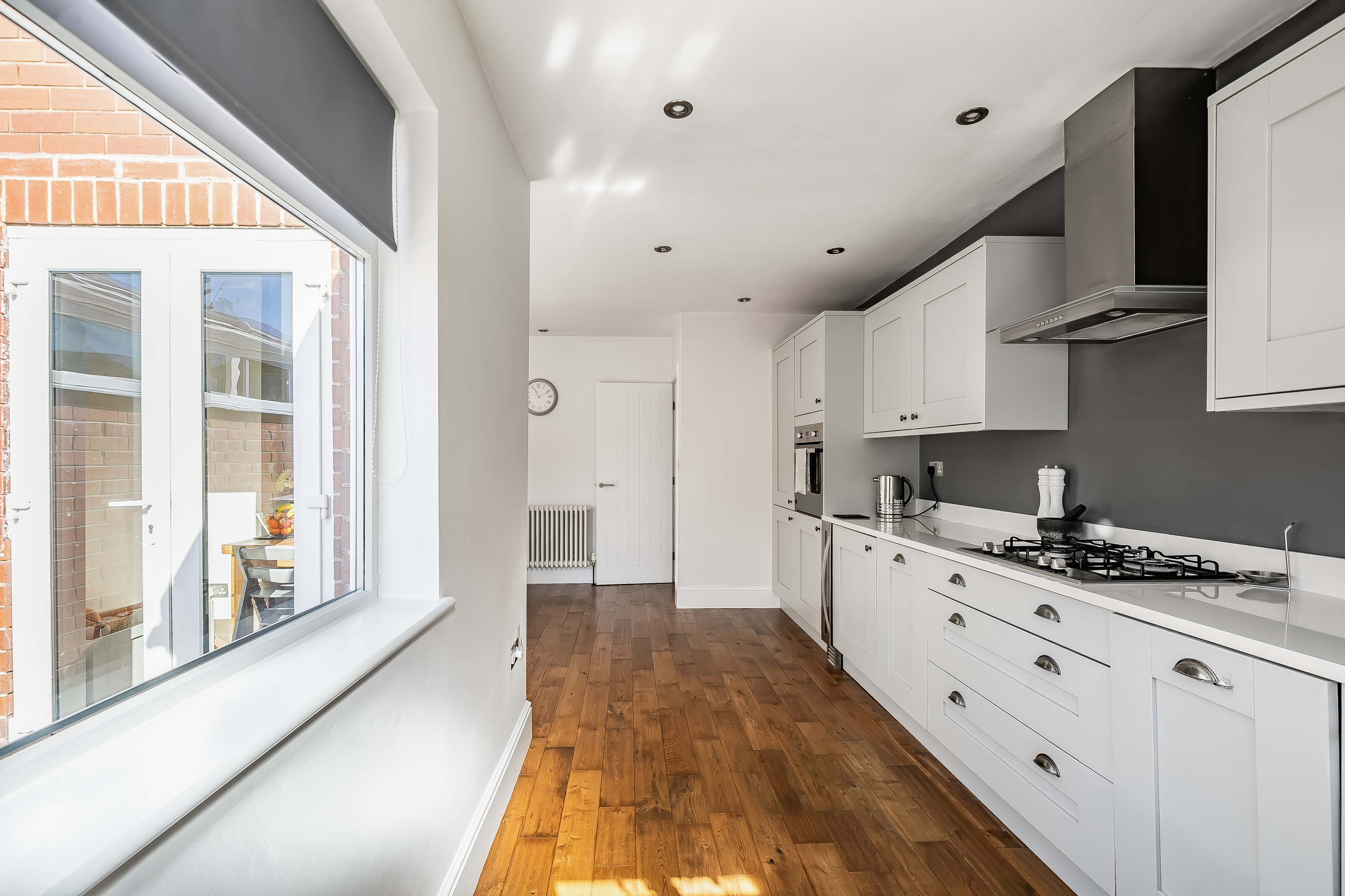 To the front, a practical driveway and gravelled garden set the house back from the road. The entrance hall opens onto a bay-fronted reception room with a feature fireplace, filled with natural light. Across the hall, a spacious open-plan kitchen and dining area provides the heart of the home, with two separate access points to the rear garden, including French doors.