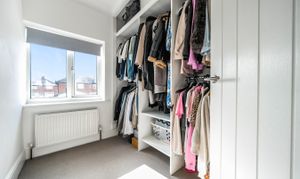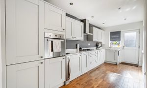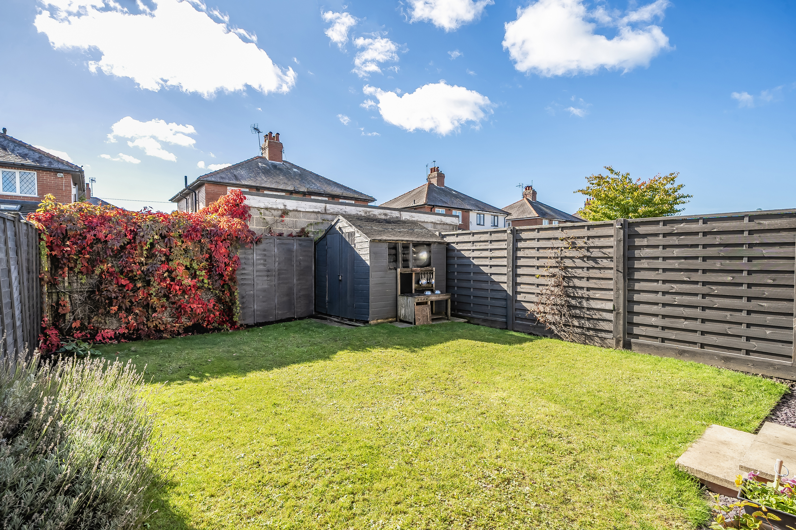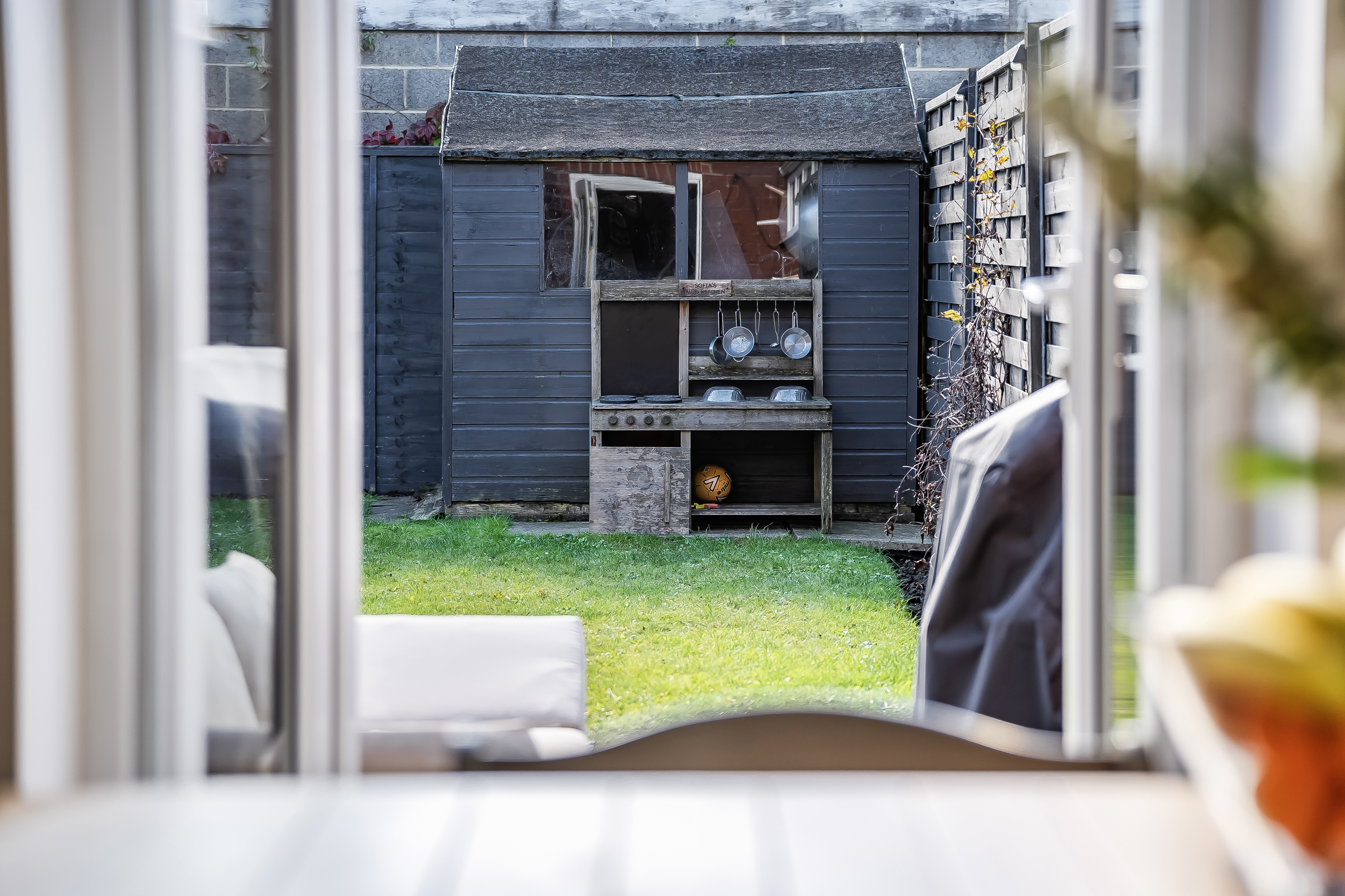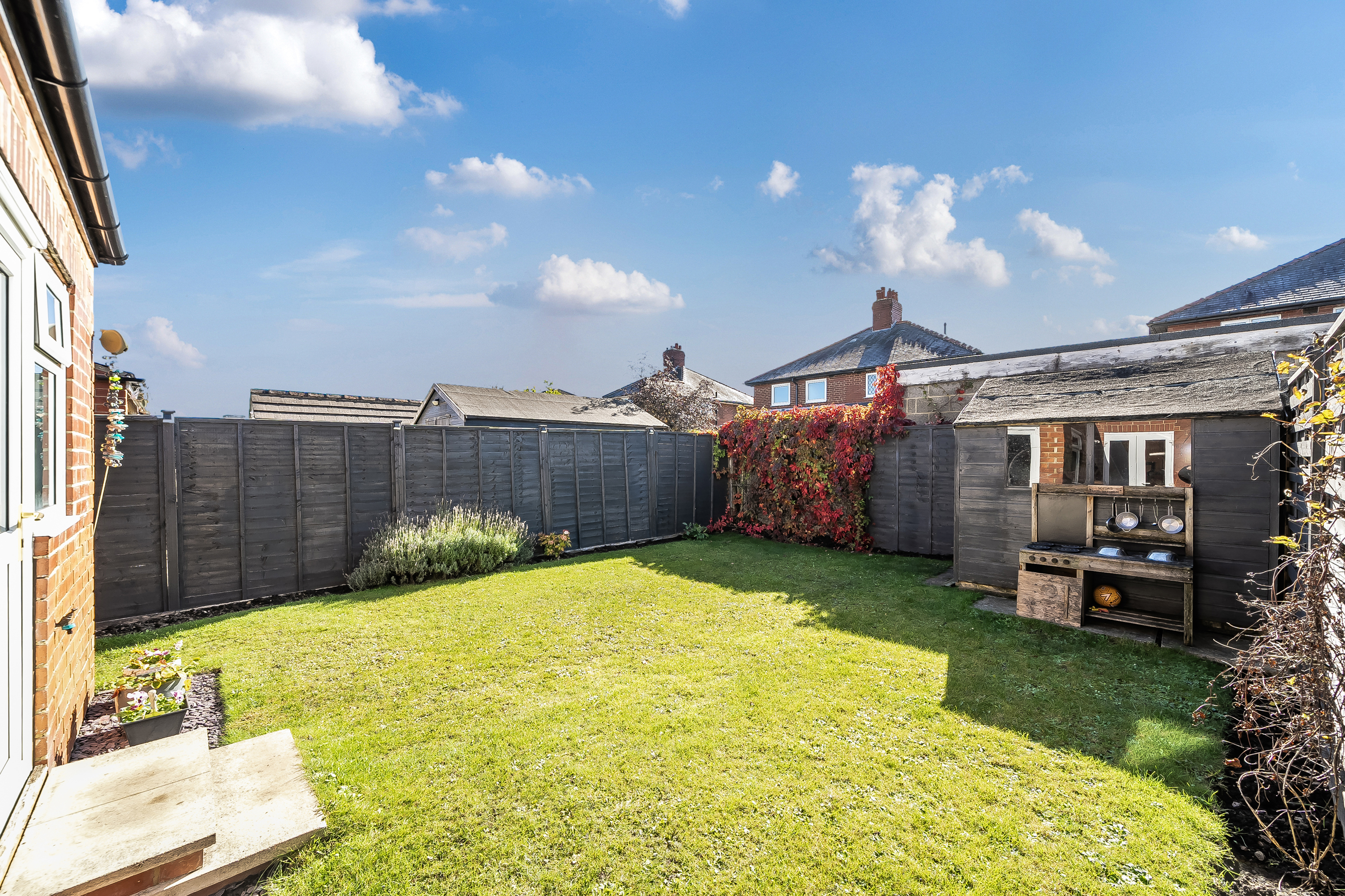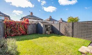 The private rear garden is generous in size, laid mainly to lawn for easy maintenance, and includes a wooden storage shed. Wrapping around to the side of the property, it also offers additional outdoor storage space.