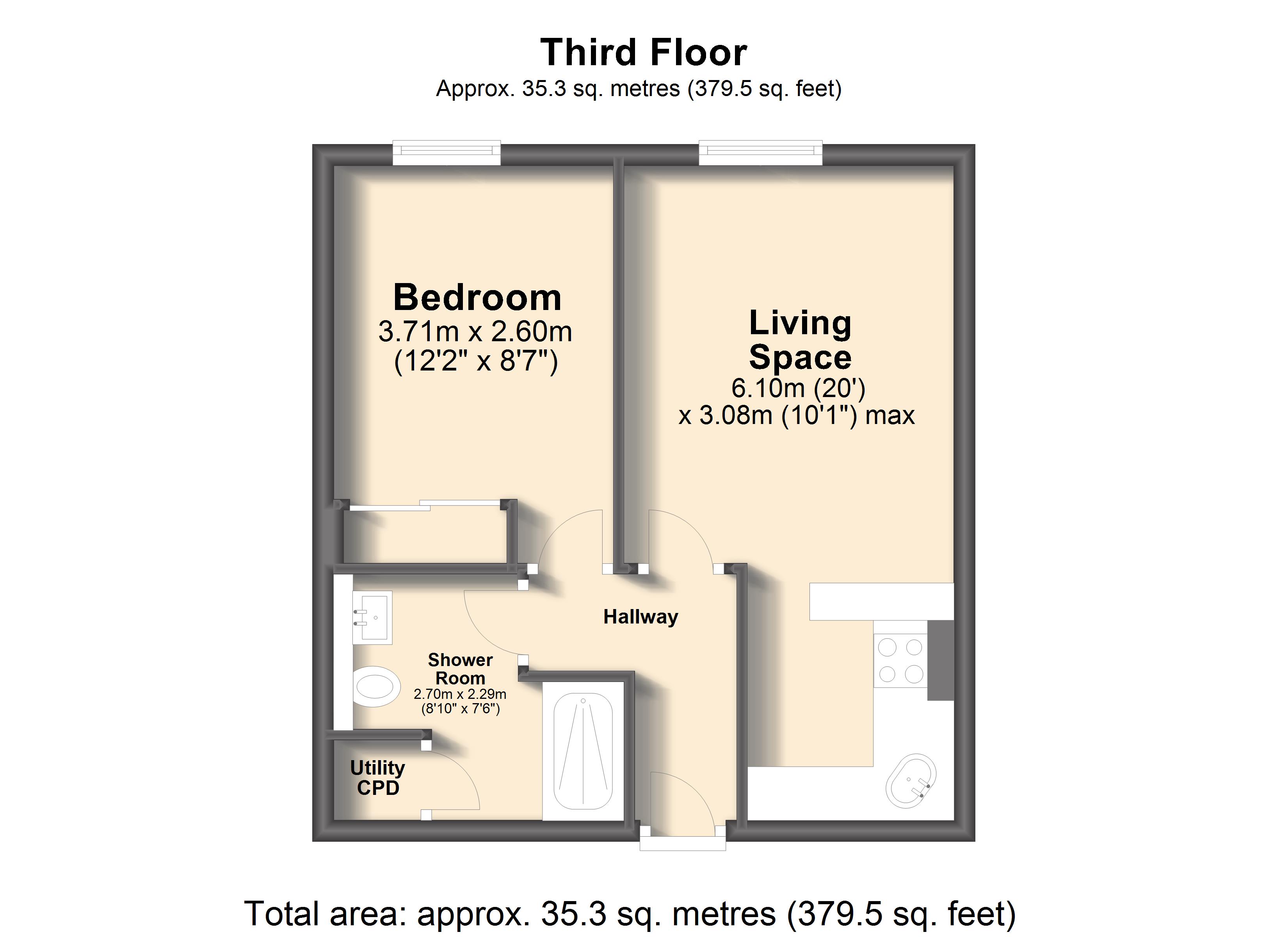 The open-plan living space features a modern breakfast kitchen with appliances, complemented by the adjoining double bedroom, which boasts fitted wardrobes. A three-piece shower room completes the layout.