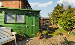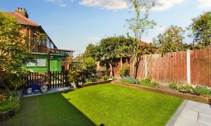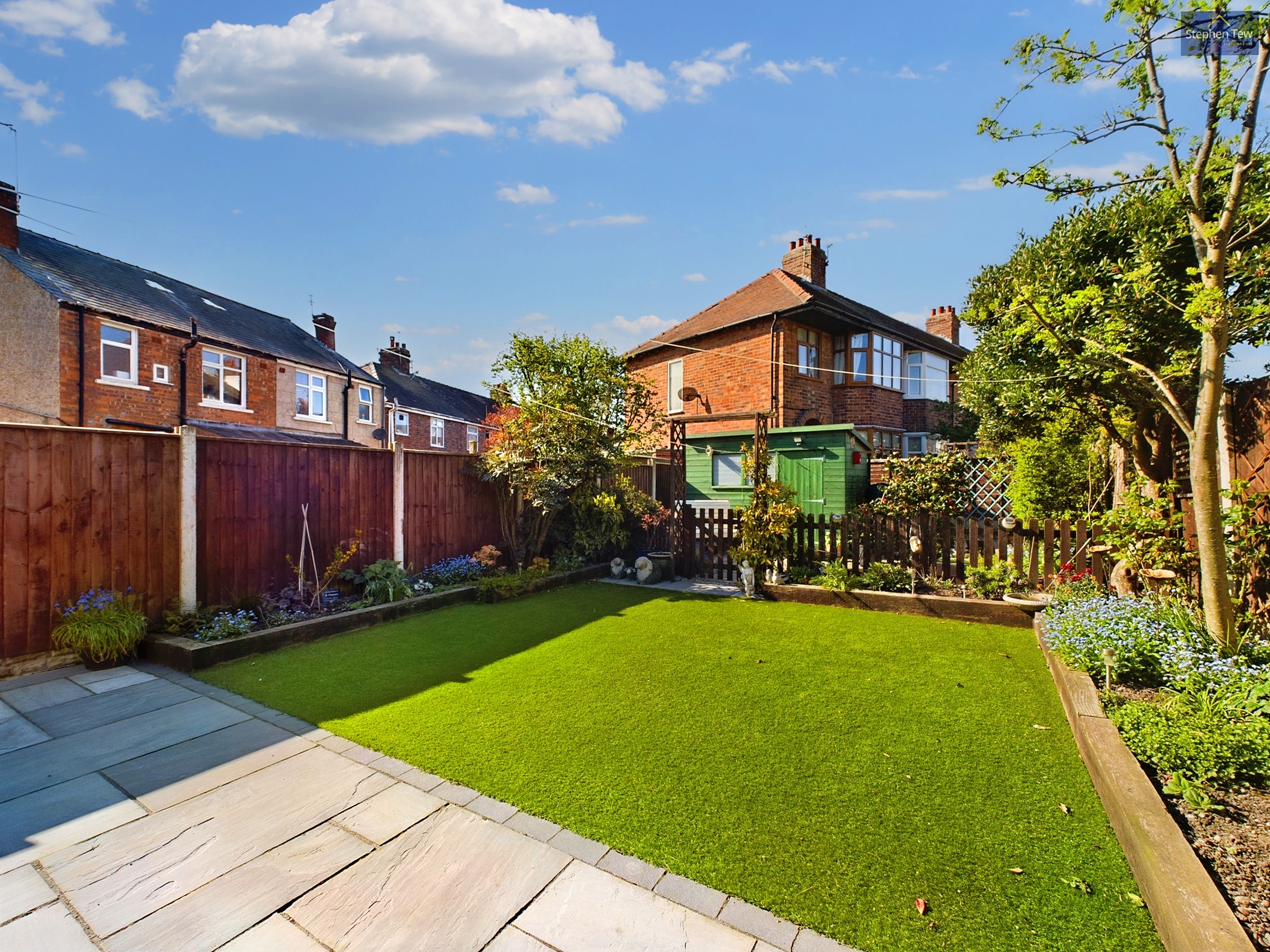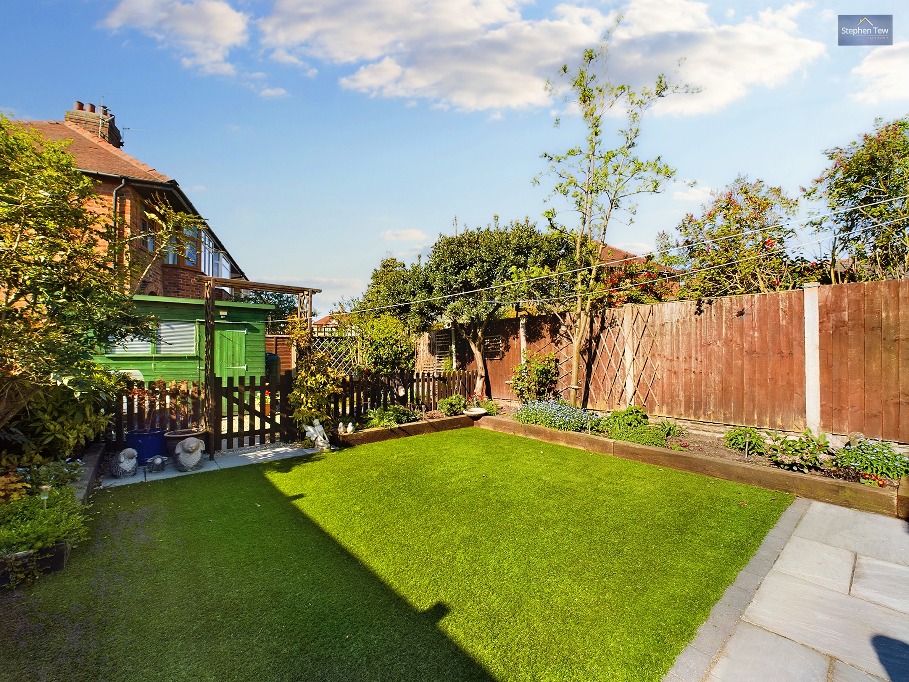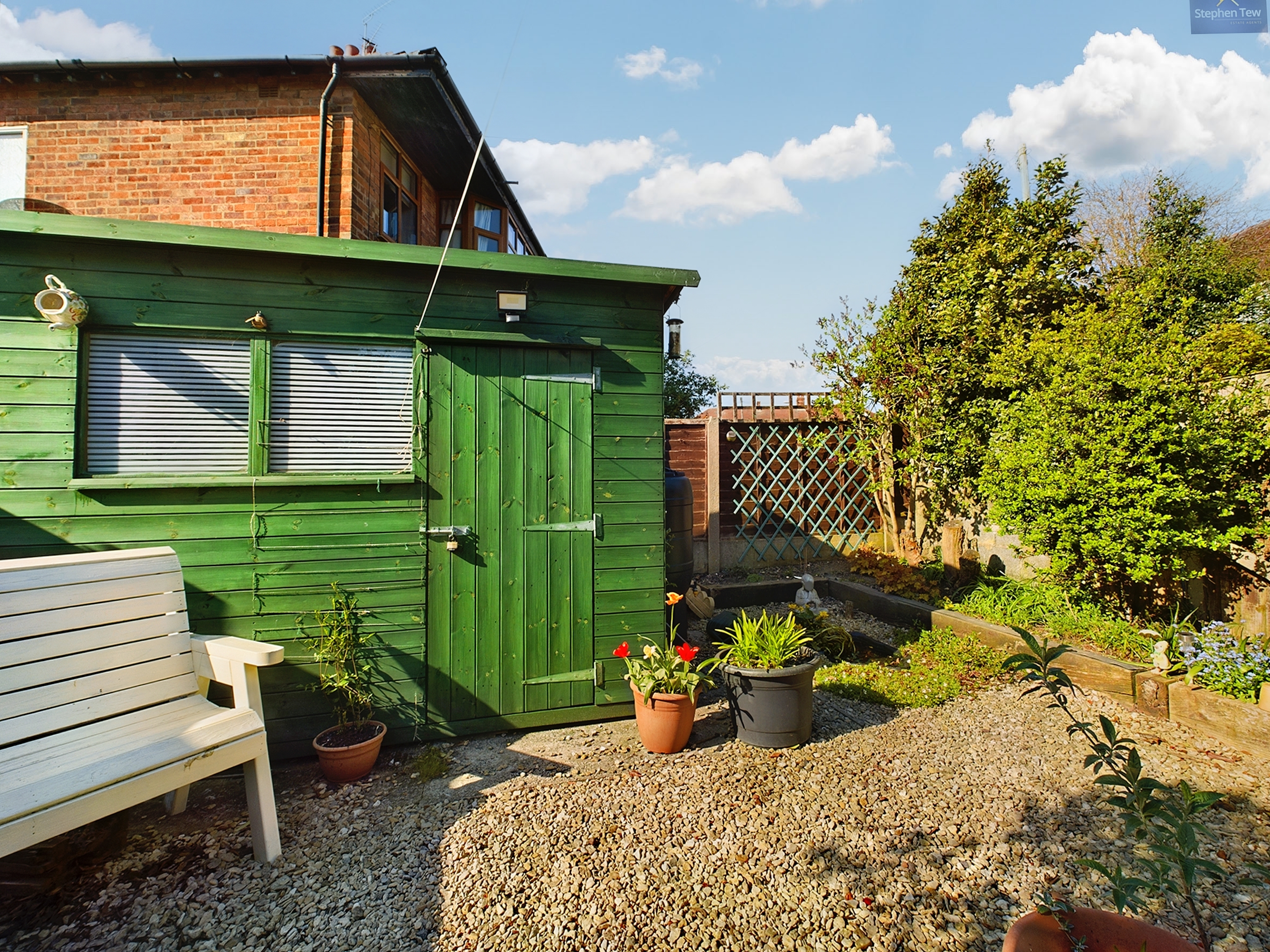 Enclosed attractive, landscaped rear garden with Indian stone paved area, artificial turf and gravelled area with raised borders, panelled fencing and wooden shed with power and light connected