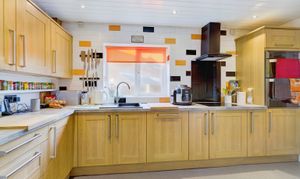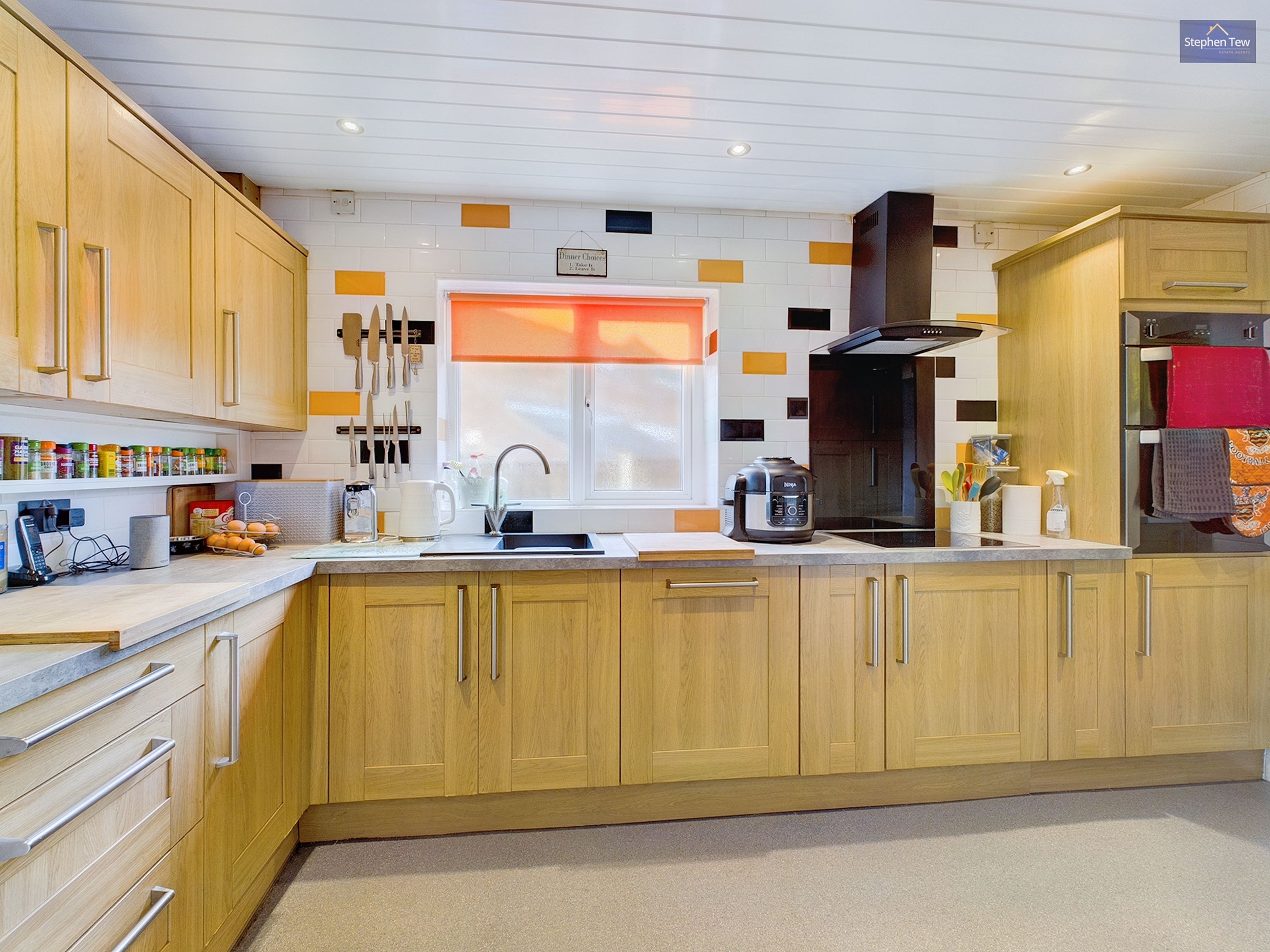 Fitted with a matching range of modern base and eye level units with worktop space, single bowl sink with mixer tap, built-in double electric oven, "Neff" induction hob with extractor hood over, integrated dishwasher. UPVC double opaque glazed window to the side elevation, opening into;