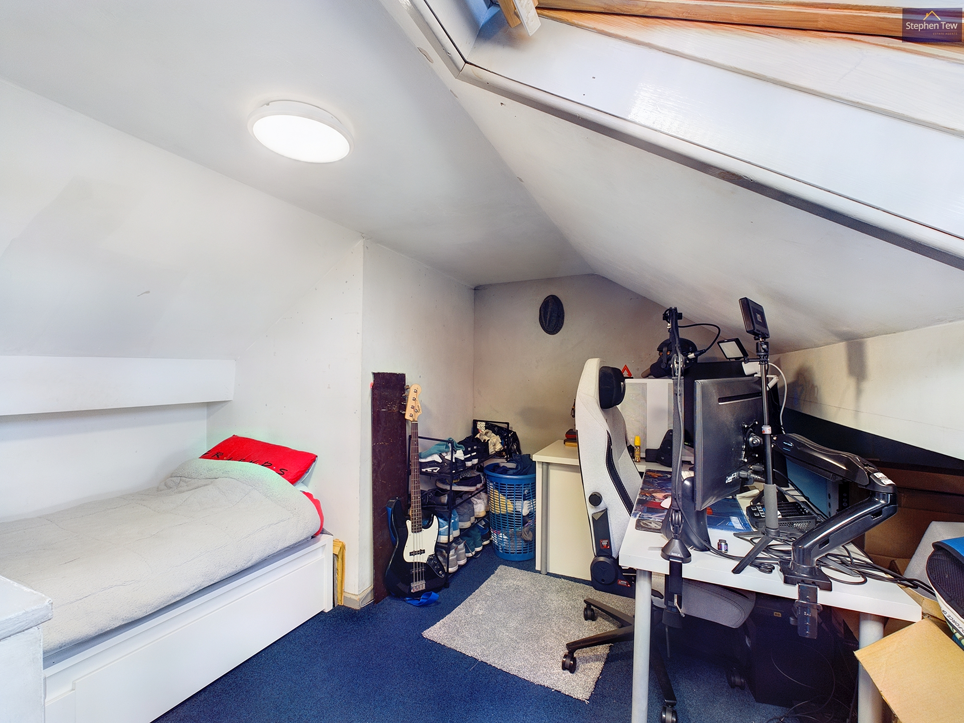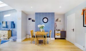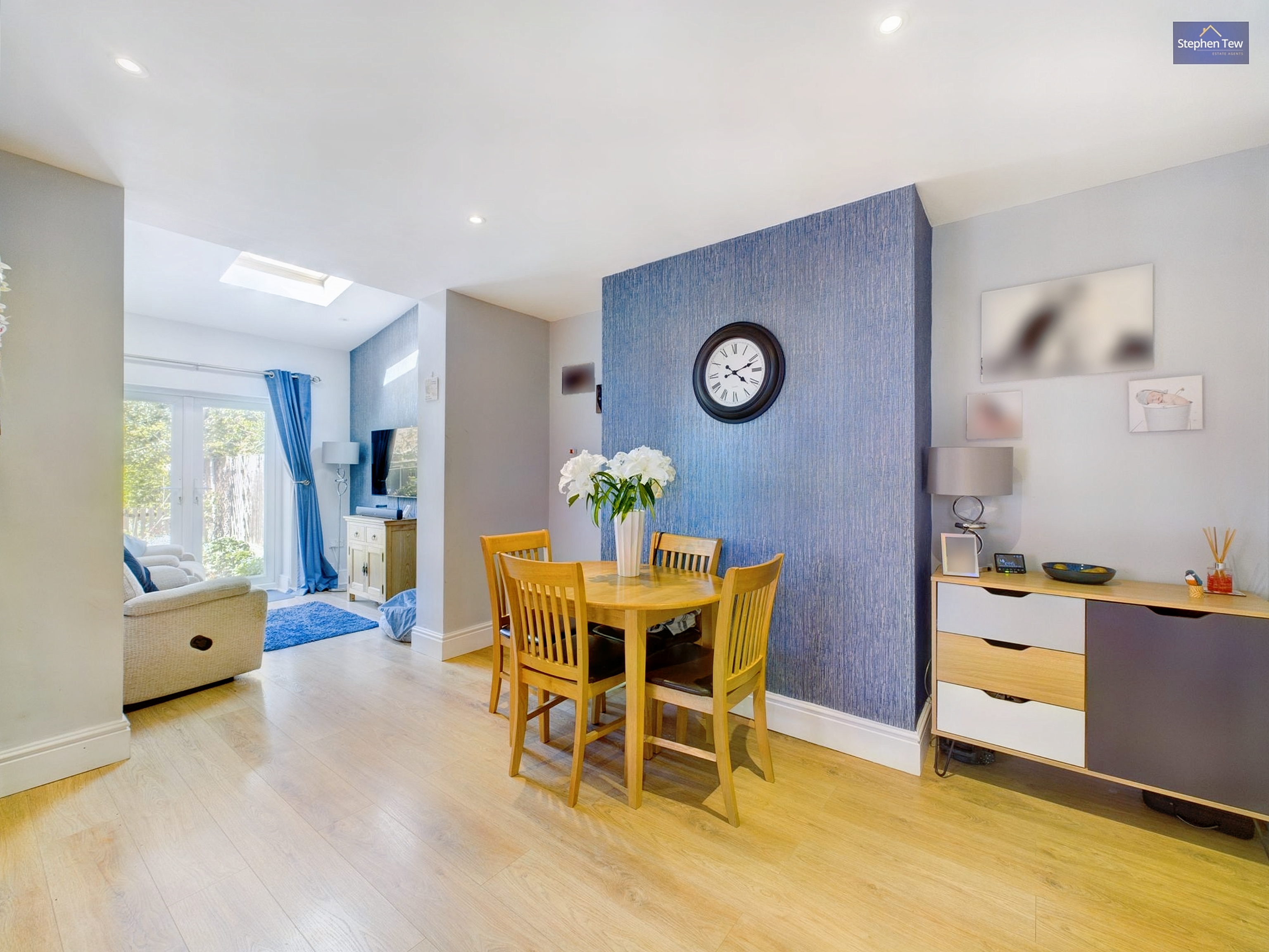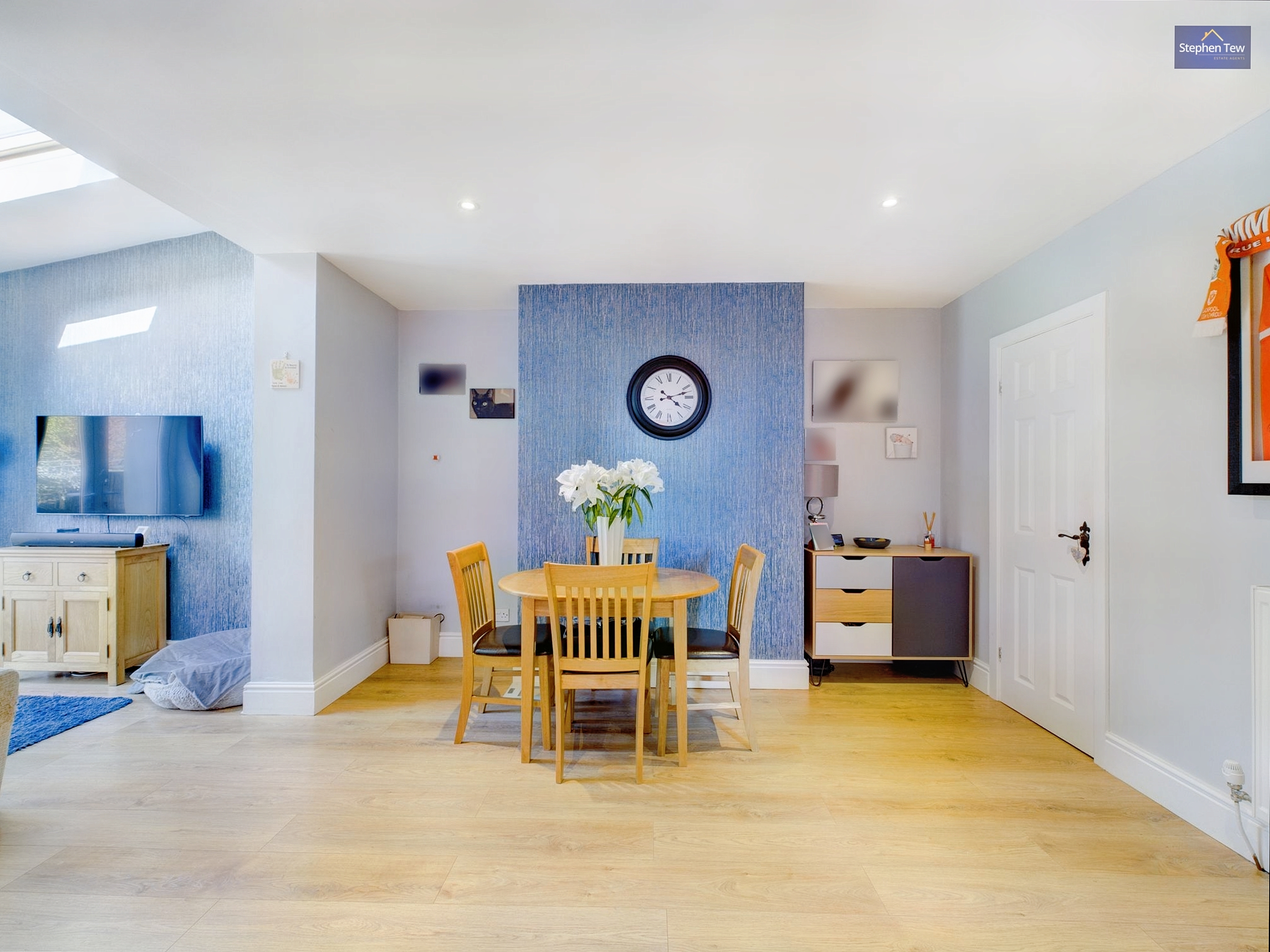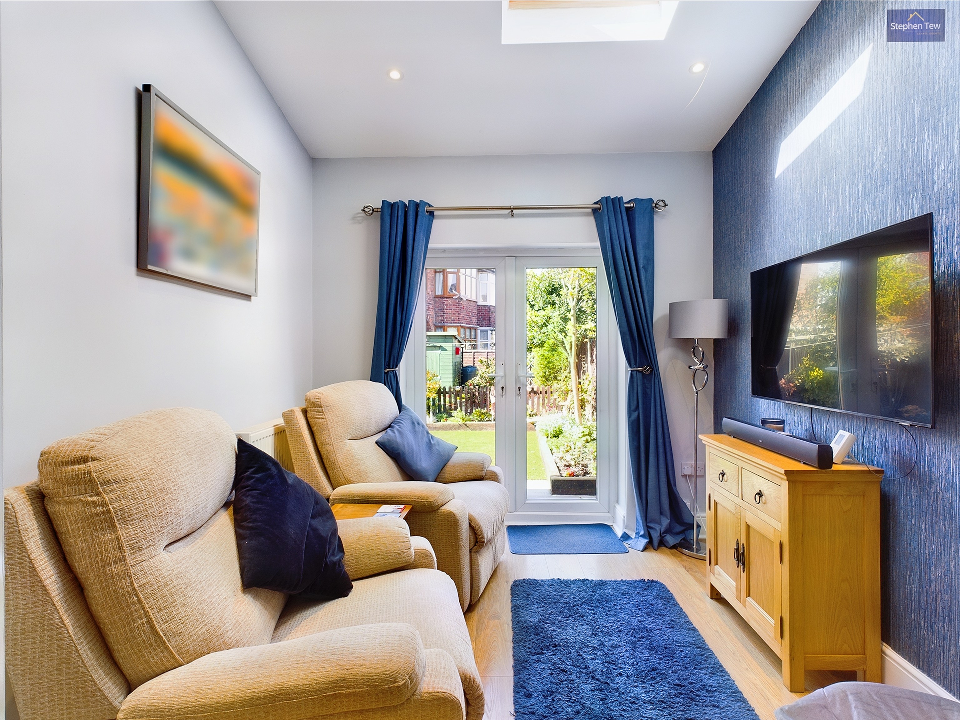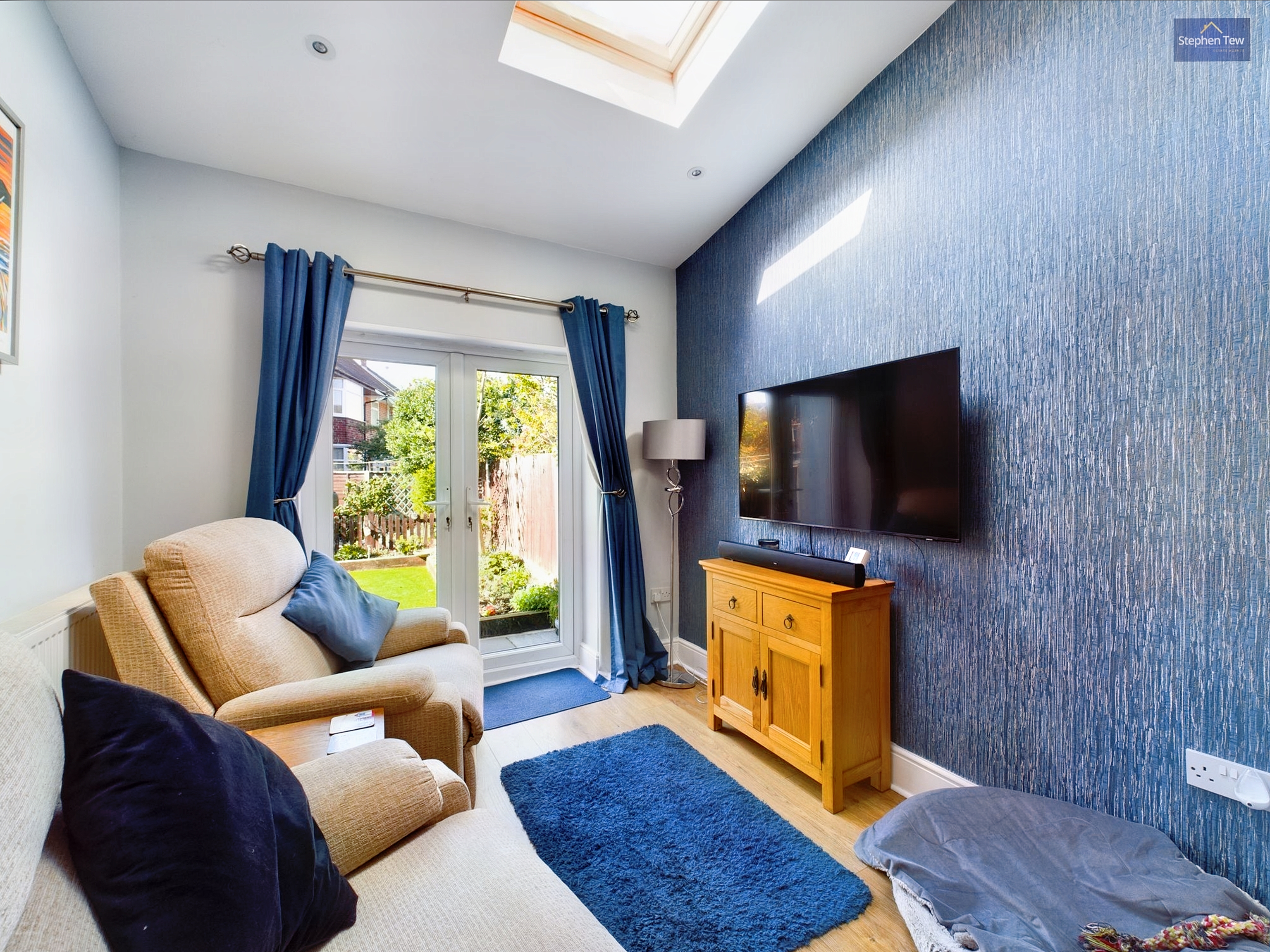 This versatile room could be utilised as an additional living room or as a dining area with wooden laminate flooring, double radiator, ceiling with recessed spotlights and double glazed Velux window. UPVC double glazed French doors leading to rear garden.