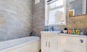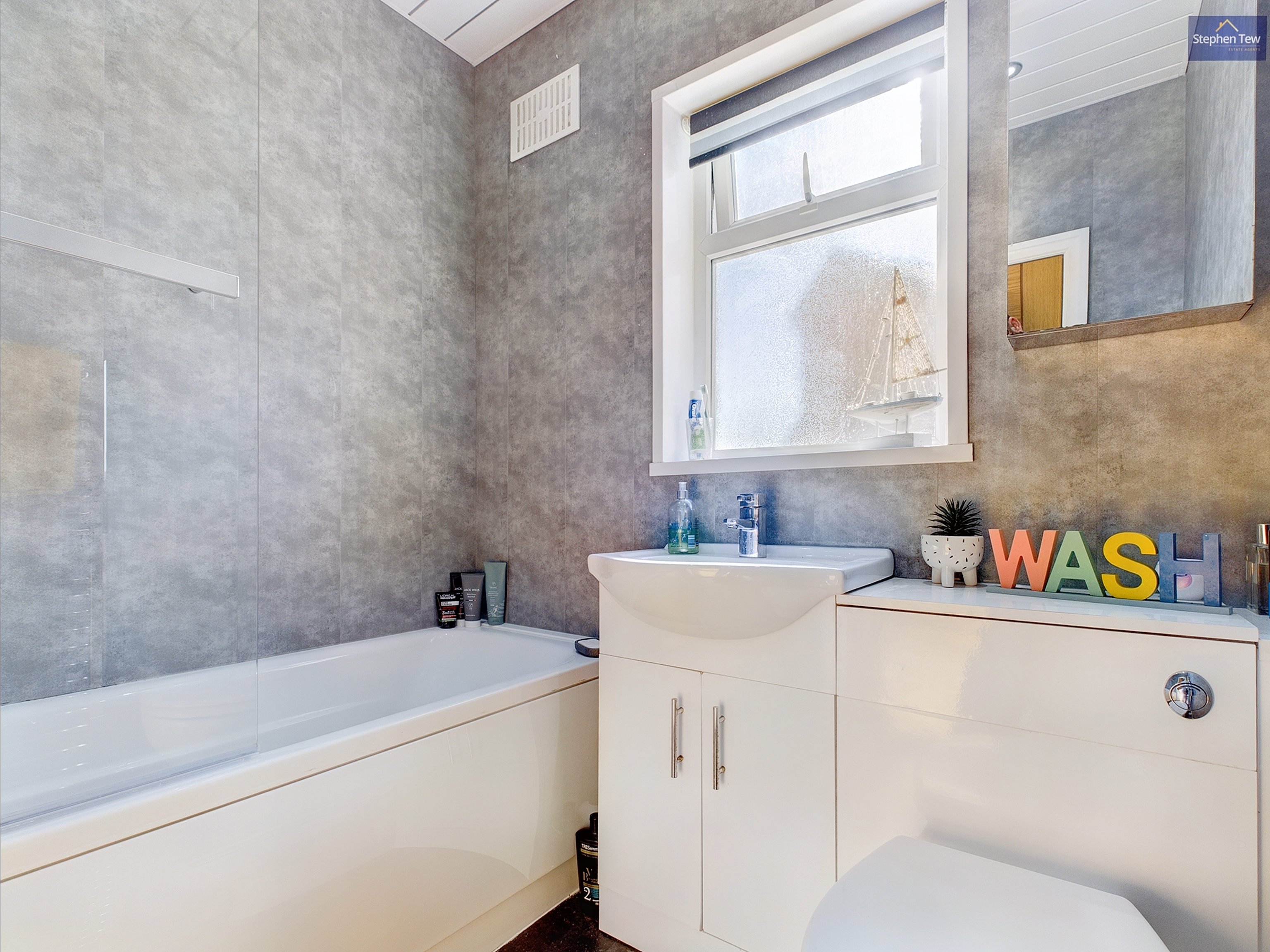Fitted with a three-piece white suite comprising panelled bath with shower attachment over and glass screen, wash hand basin with storage beneath and low flush WC. Heated towel rail and UPVC double opaque glazed window to the side.