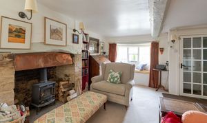 Occupying an elevated setting along a quiet lane, the property is defined by its honey-hued Cotswold stone façade, complemented by timber detailing. Entry is via a practical porch, opening into the principal reception room, where the home’s period charm is immediately apparent. The space is centred around a substantial stone fireplace with a wood-burning stove, while a deep-set window with an integrated seat invites an abundance of natural light. To the rear, the kitchen and dining area are thoughtfully arranged to create a sense of openness while maintaining a clear distinction between the two spaces, offering both practicality and a sociable atmosphere. From here, a door leads directly out to the rear patio garden—ideal for outdoor dining and entertaining during the warmer months.