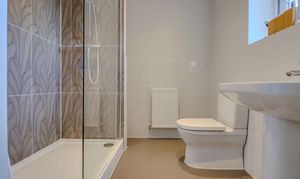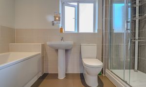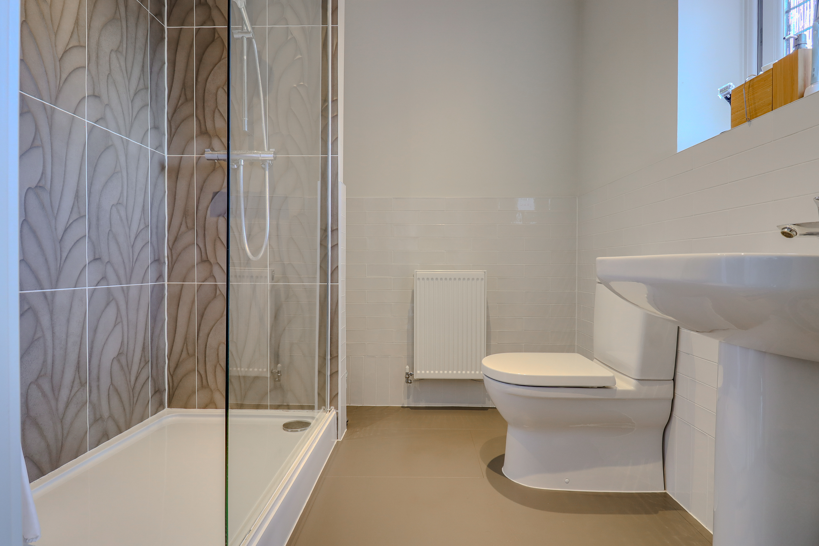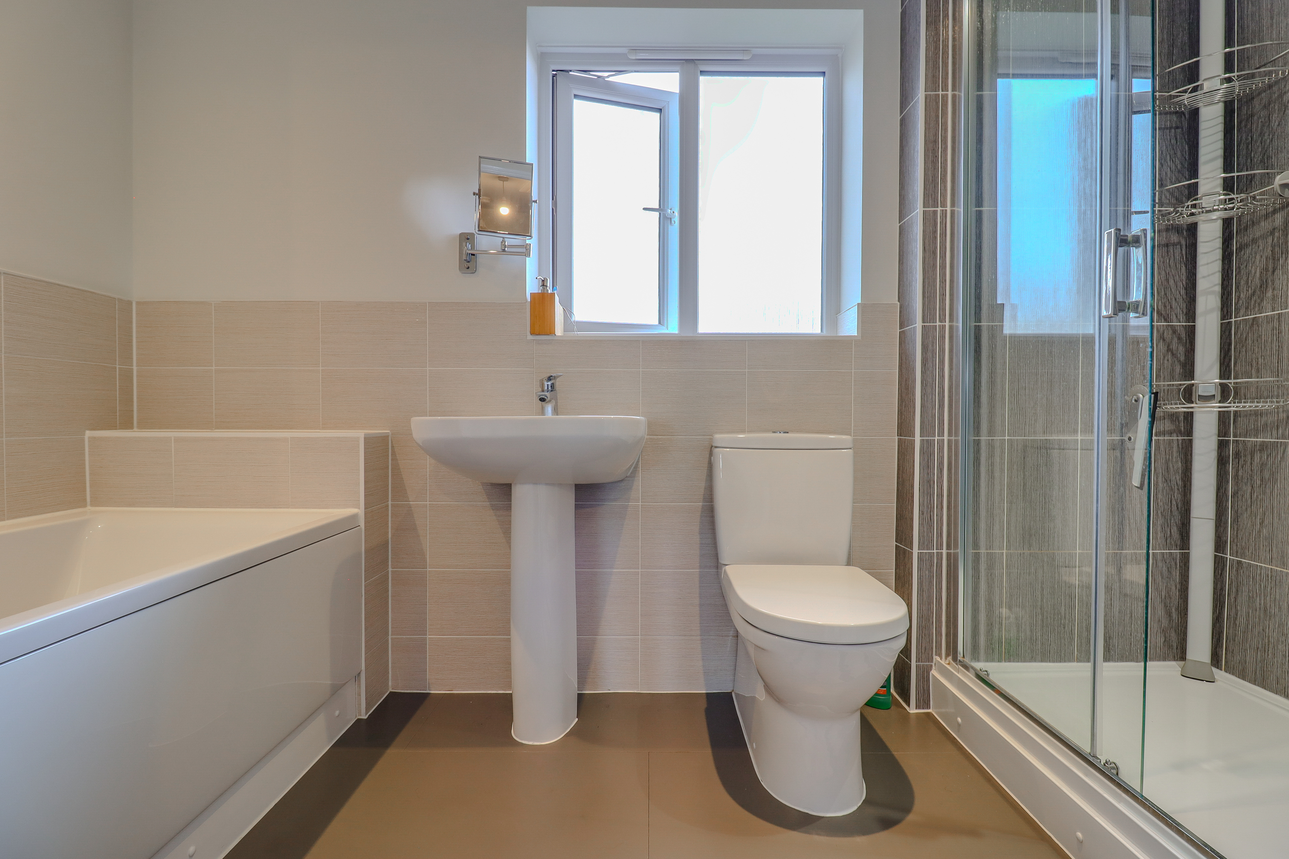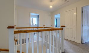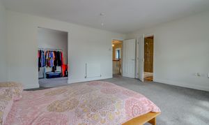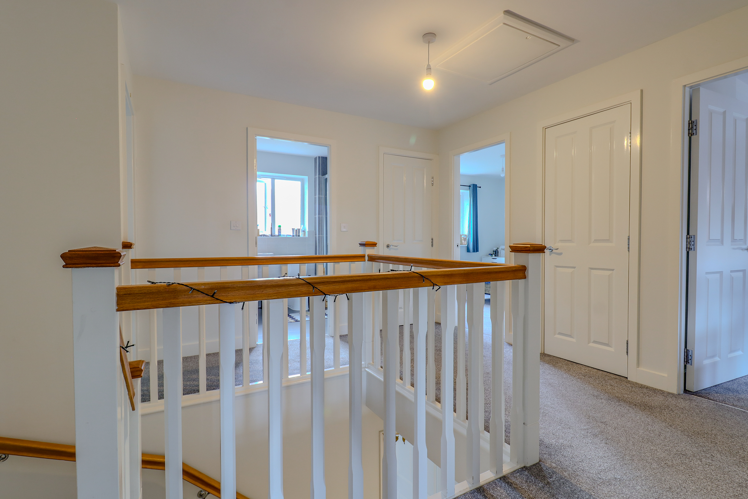 To the first floor there is a fantastic galleried landing with storage cupboards off and a door to an incredibly spacious master bedroom with a feature display box bay window to the front, a large dressing area and a generous en-suite shower room. There are three further exceptional double bedrooms, all with fitted wardrobes and there is a well appointed family bathroom with a panelled bath, separate shower, pedestal wash hand basin and a low flush WC.