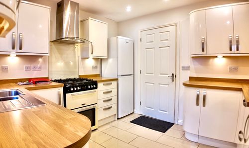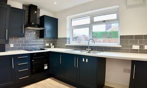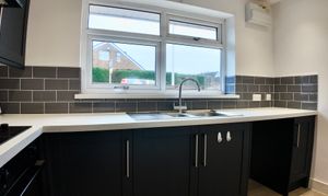 The kitchen is a true highlight, equipped with contemporary units, integrated appliances, and stylish backsplashes. The design is both functional and attractive, with wood-effect flooring and a large window ensuring the space feels both modern and welcoming. Whether you love to cook or simply enjoy spending time in a bright, thoughtfully designed area, this kitchen will not disappoint.