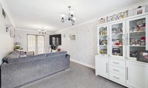 Window to front, with radiator, carpet flooring, French doors to conservatory, and further door returning to the inner hallway.