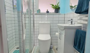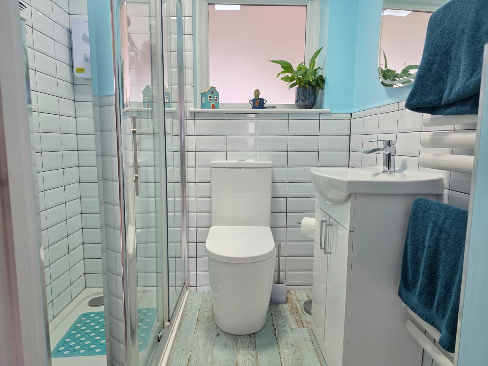 Includes a walk-in shower cubicle, low level flush WC, vanity unit with integrated ceramic sink and mixer tap, heated towel rail, part tiled walls and obscure UPVC double glazed window.