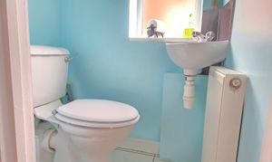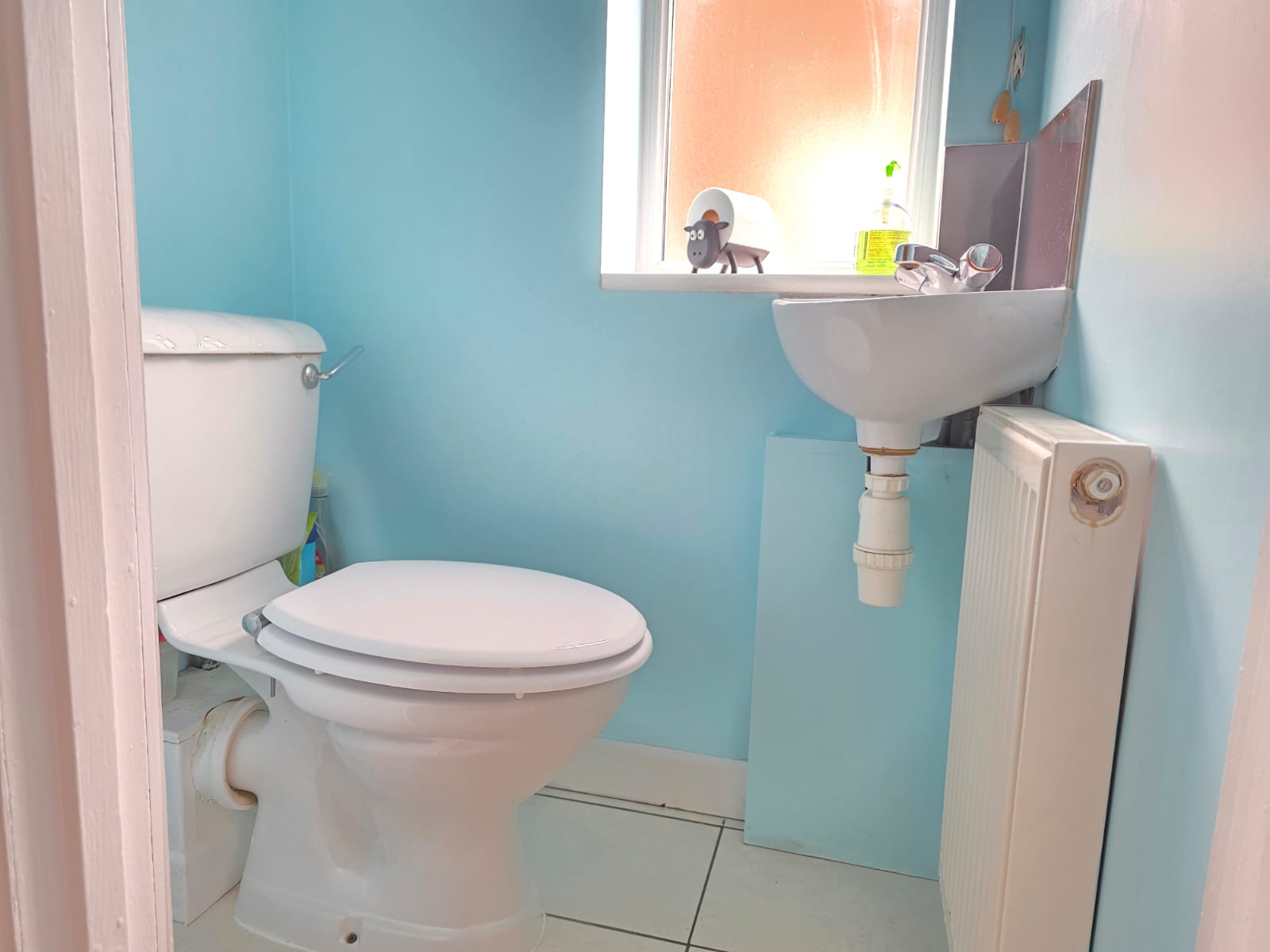 Offers a low level WC, corner wash hand basin with mixer tap and tiled splashbacks, radiator, tiled flooring and obscure UPVC double glazed window.
