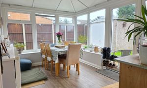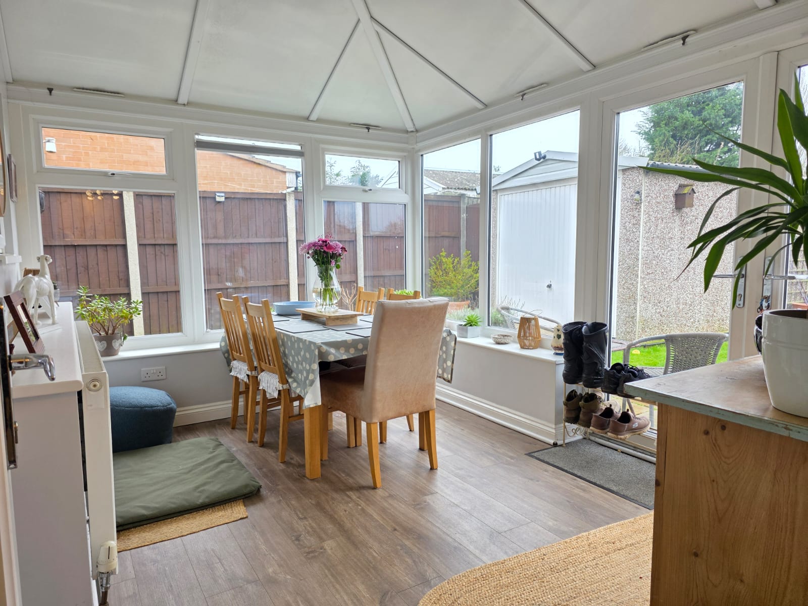 This UPVC double glazed conservatory with UPVC opaque and insulated roof benefits from laminate flooing and radiator along with double doors out to the rear garden.