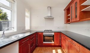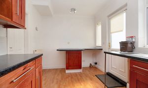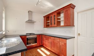 With laminate flooring, oven, hob, extractor fan, laminate work surfaces, sink/drainer, double glazed windows, space for appliances and door leading to the garden.