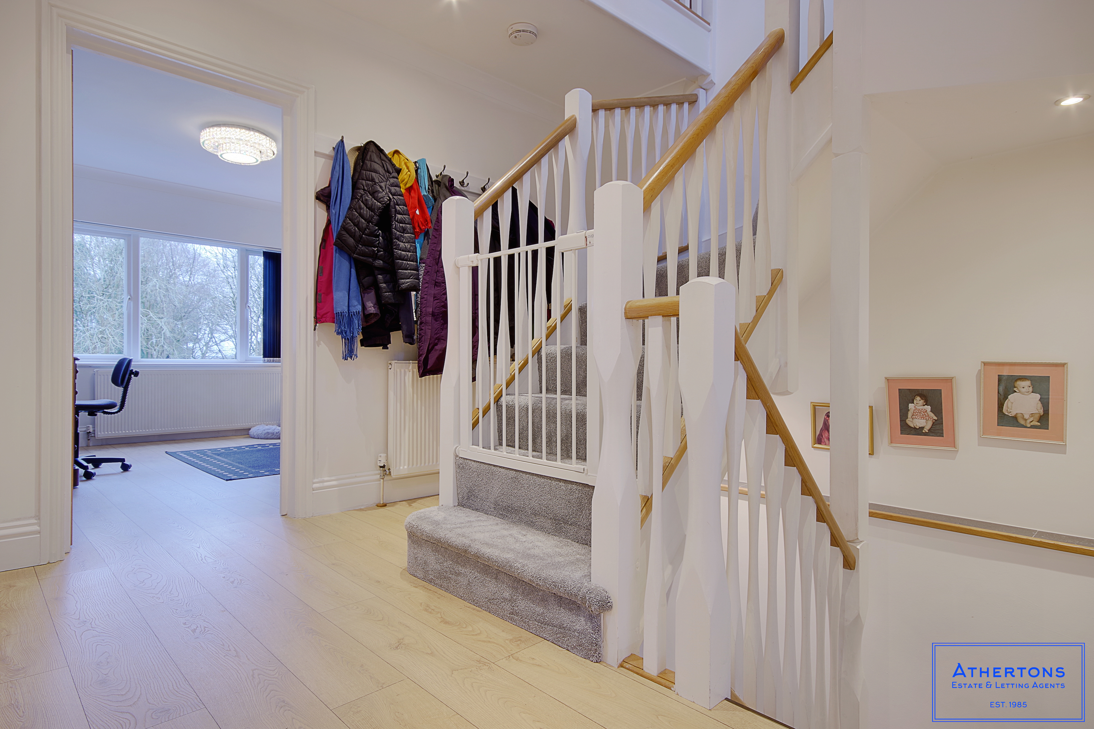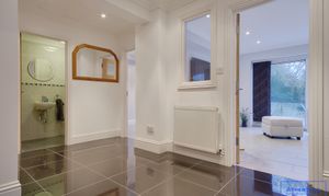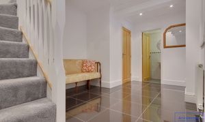 The property is entered via a striking and spacious reception hallway, setting an immediate sense of grandeur, with staircases leading to both the upper and lower levels. The ground floor offers superb living and entertaining space, including a large open-plan kitchen/breakfast room, a separate utility room, and an elegant living room enjoying views over the rear garden.