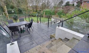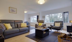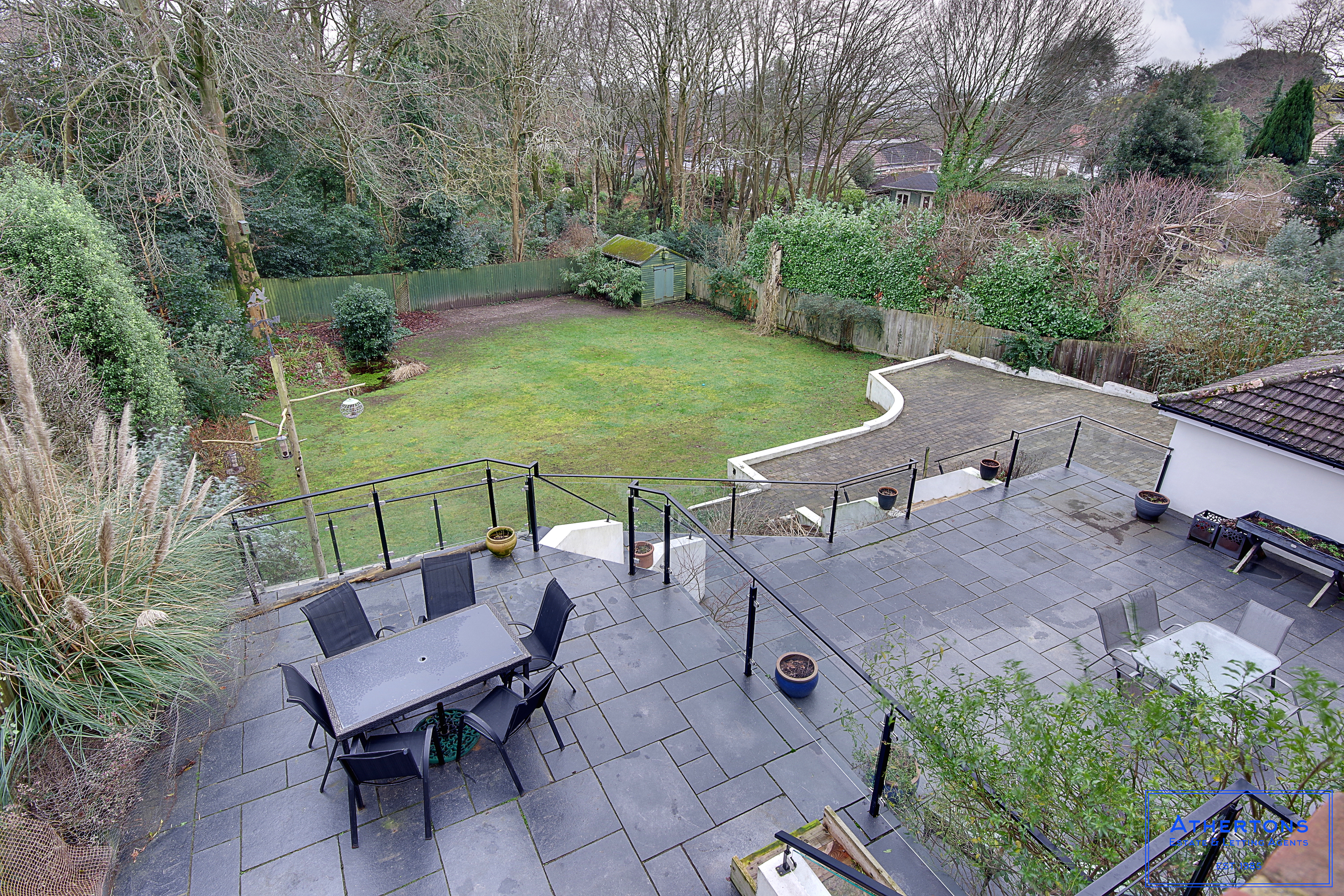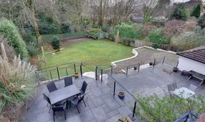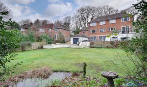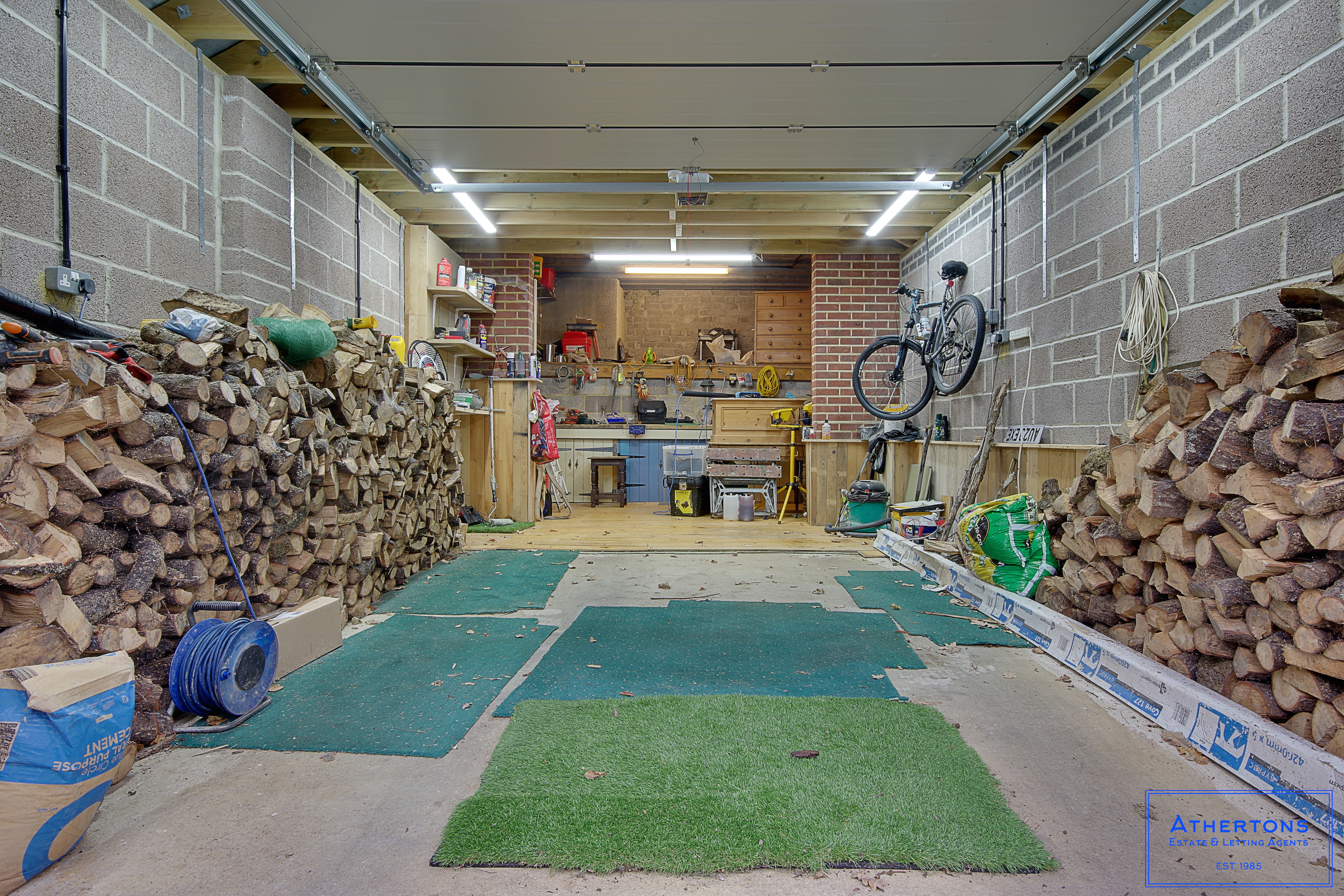 Externally, the front of the property is attractively landscaped, featuring a gated in-and-out driveway and access to a spacious garage. A further driveway leads to the rear, providing secure parking for a small motorhome or boat. The rear garden is a true highlight, private, tranquil, and surrounded by mature trees, creating a peaceful retreat with multiple seating areas and access to an additional large garage/workshop.