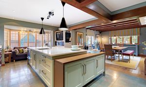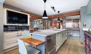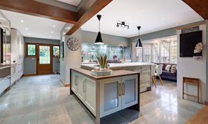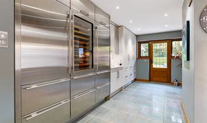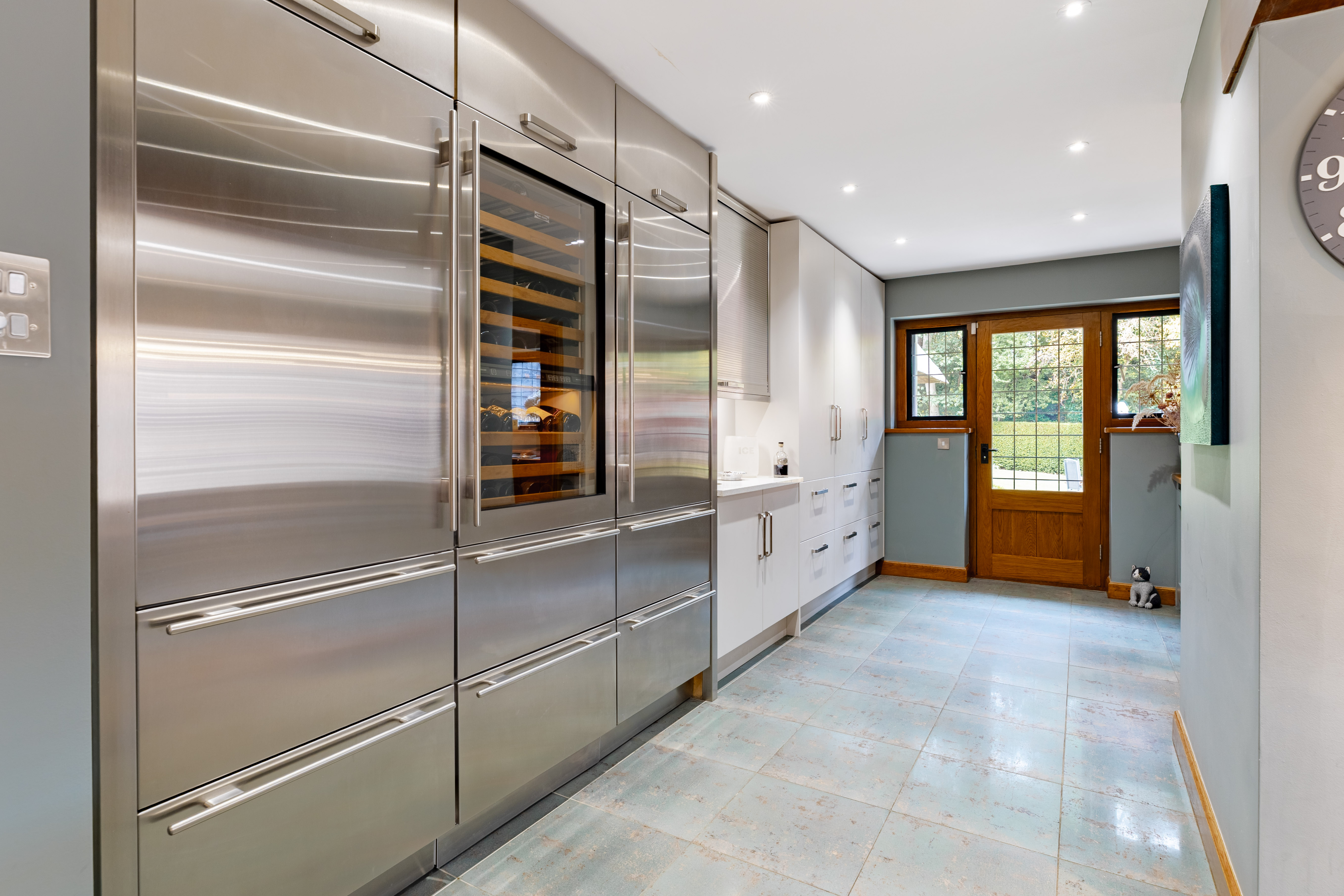 A grand reception hall provides an impressive welcome, setting the tone for the home’s generous scale and character. The principal living areas begin with a large drawing room with a feature fireplace, elegant bay window, and views over the main grounds. The kitchen/dining room is fitted to a high standard with a large central island, ample storage, an impressive Sub Zero fridge/freezer with built-in wine fridge, integrated appliances, and an Aga. The formal dining area is ideal for family dinners or entertaining, while a separate utility room offers further practicality.