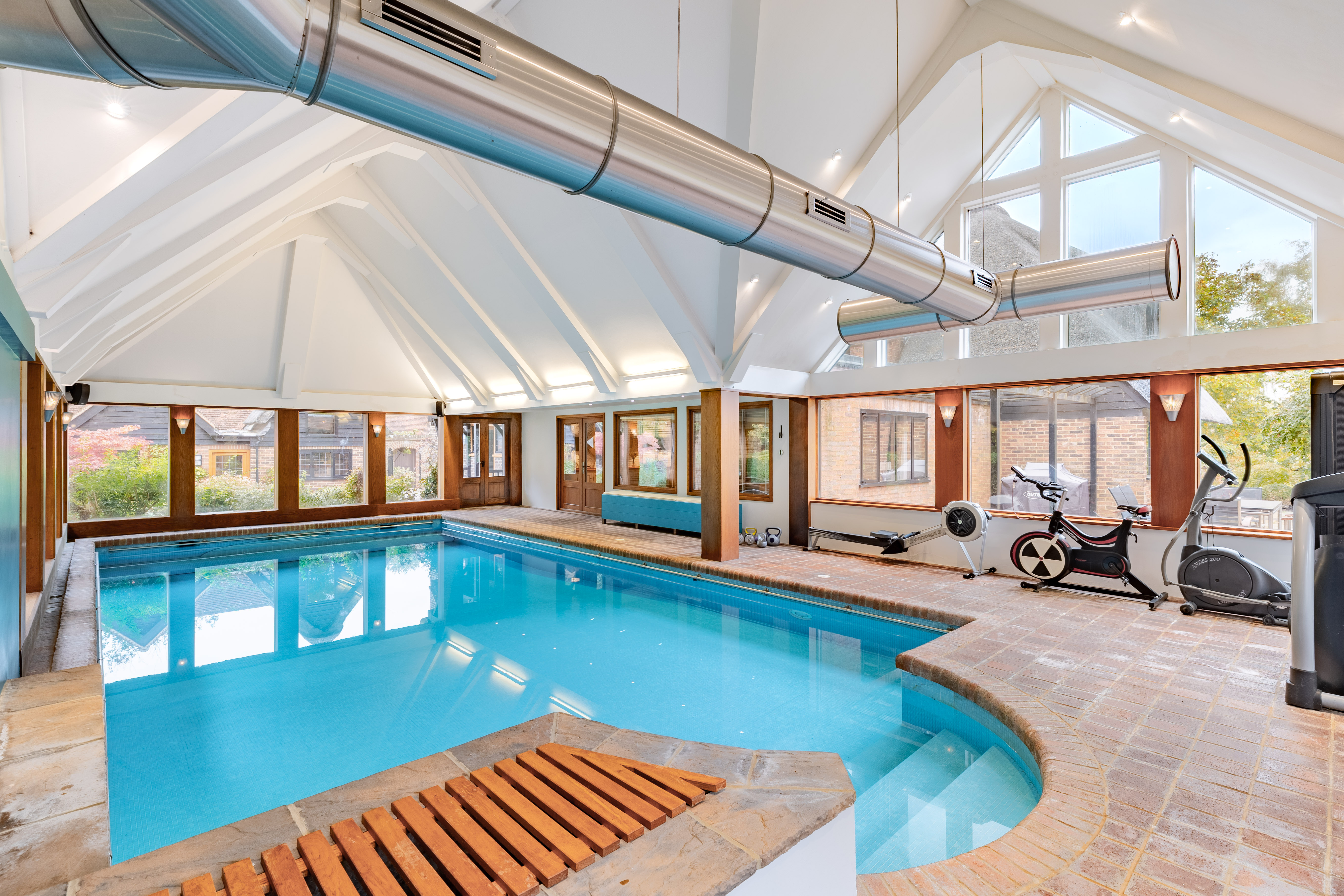 To the rear, a second sitting room with an original brick fireplace and built-in storage unit offers a quiet and relaxing space. Finally, the indoor swimming pool and adjoining shower room provide a superb leisure facility that opens directly onto the gardens and completes the ground floor with a luxurious touch.