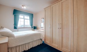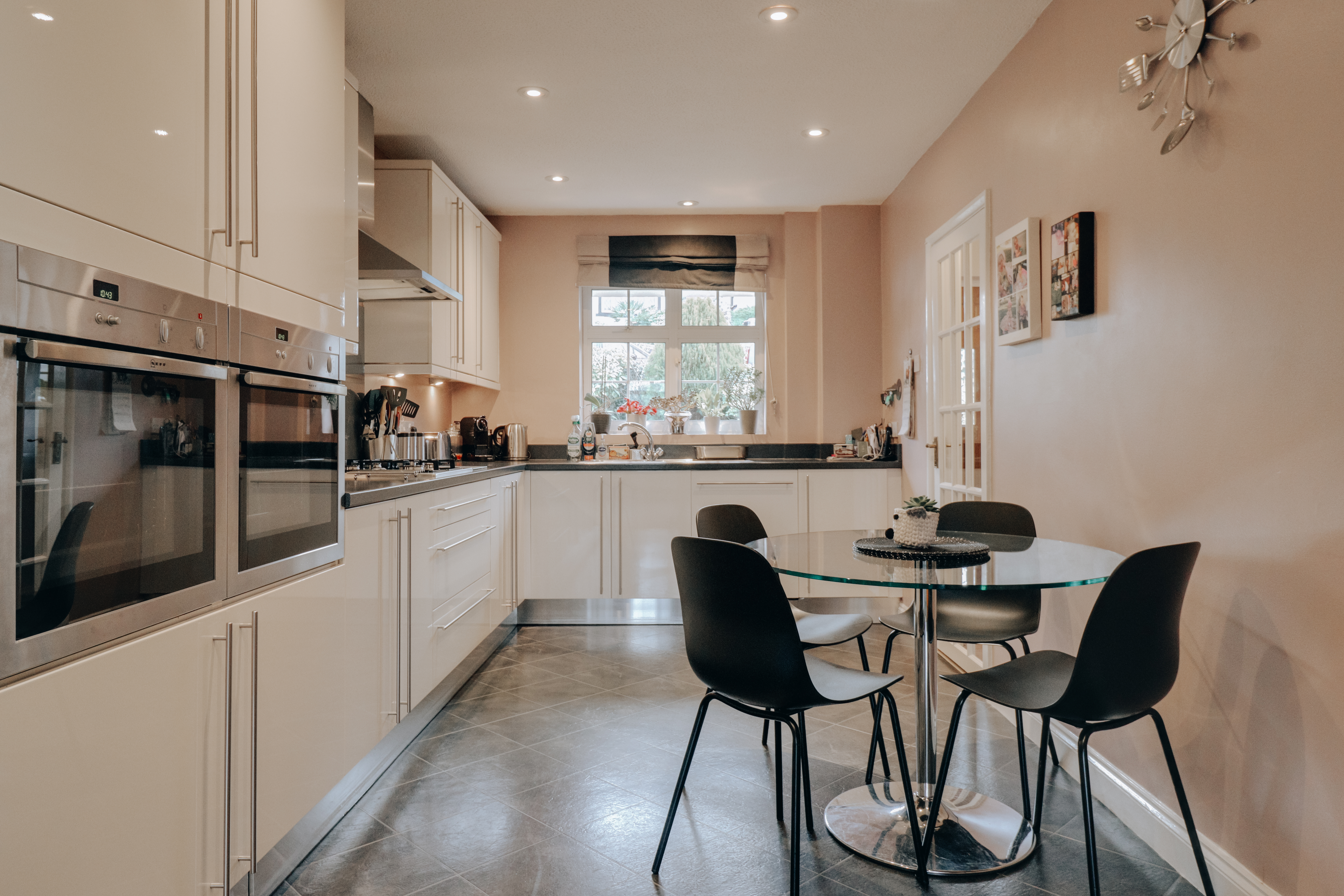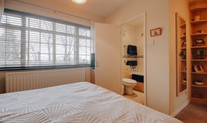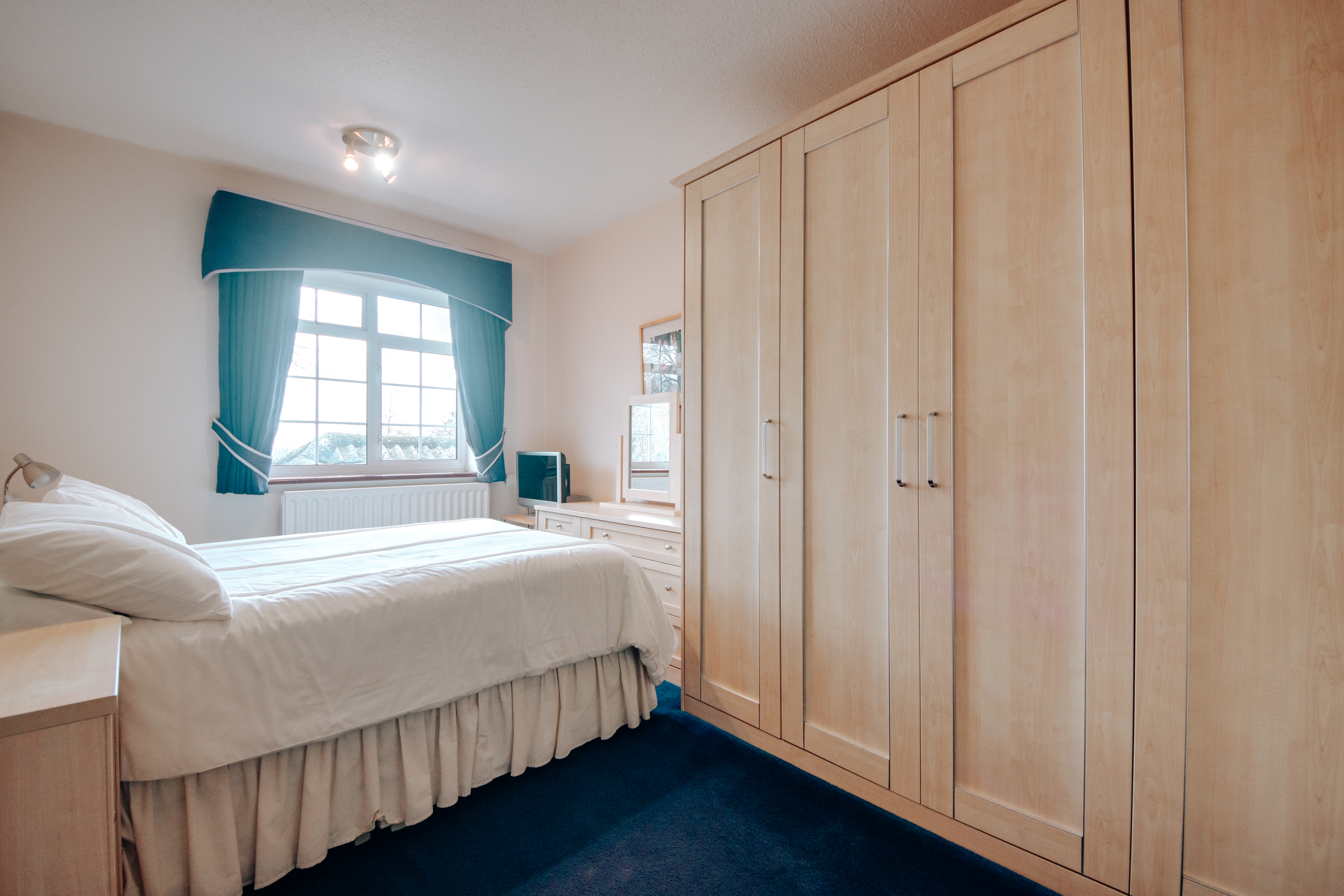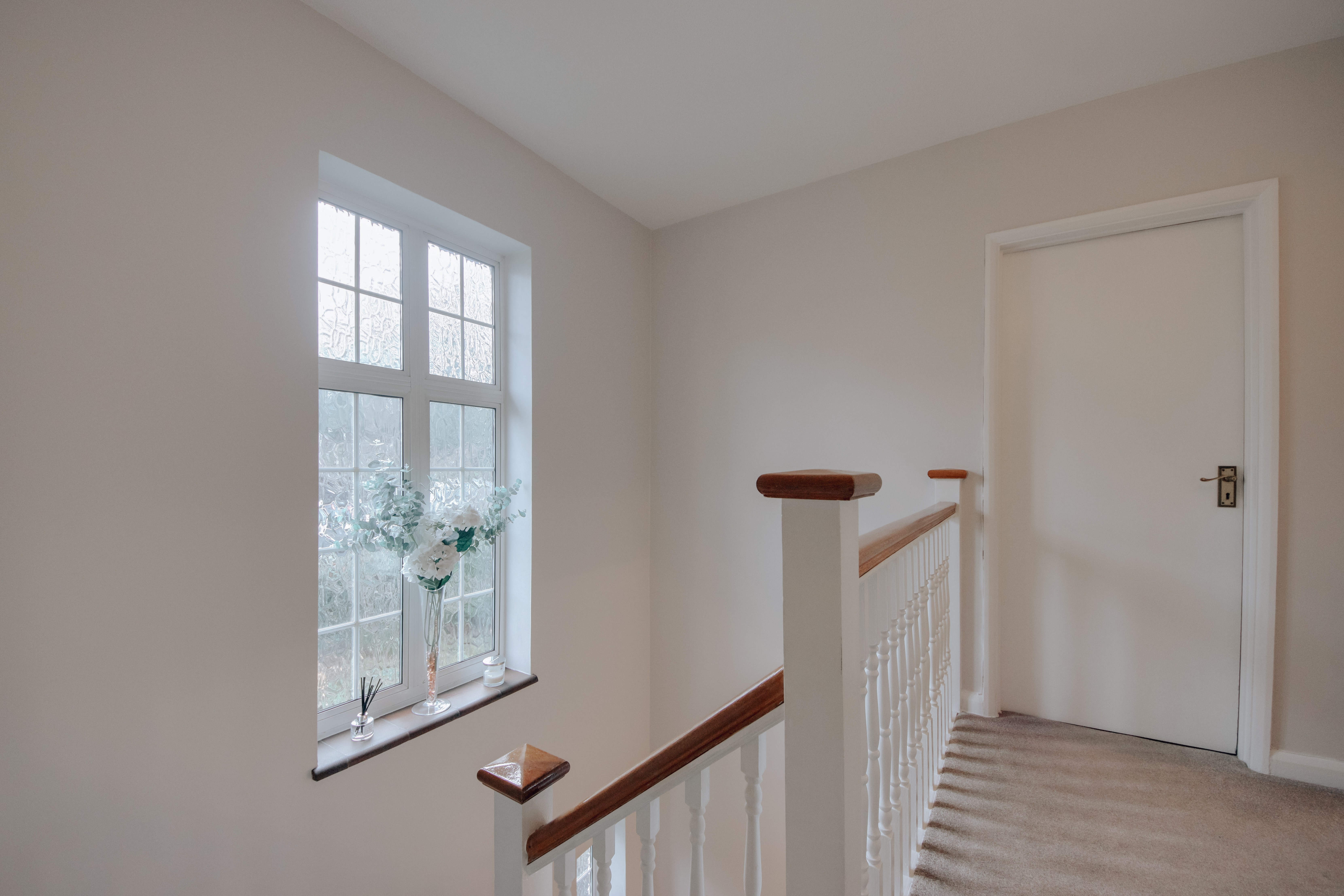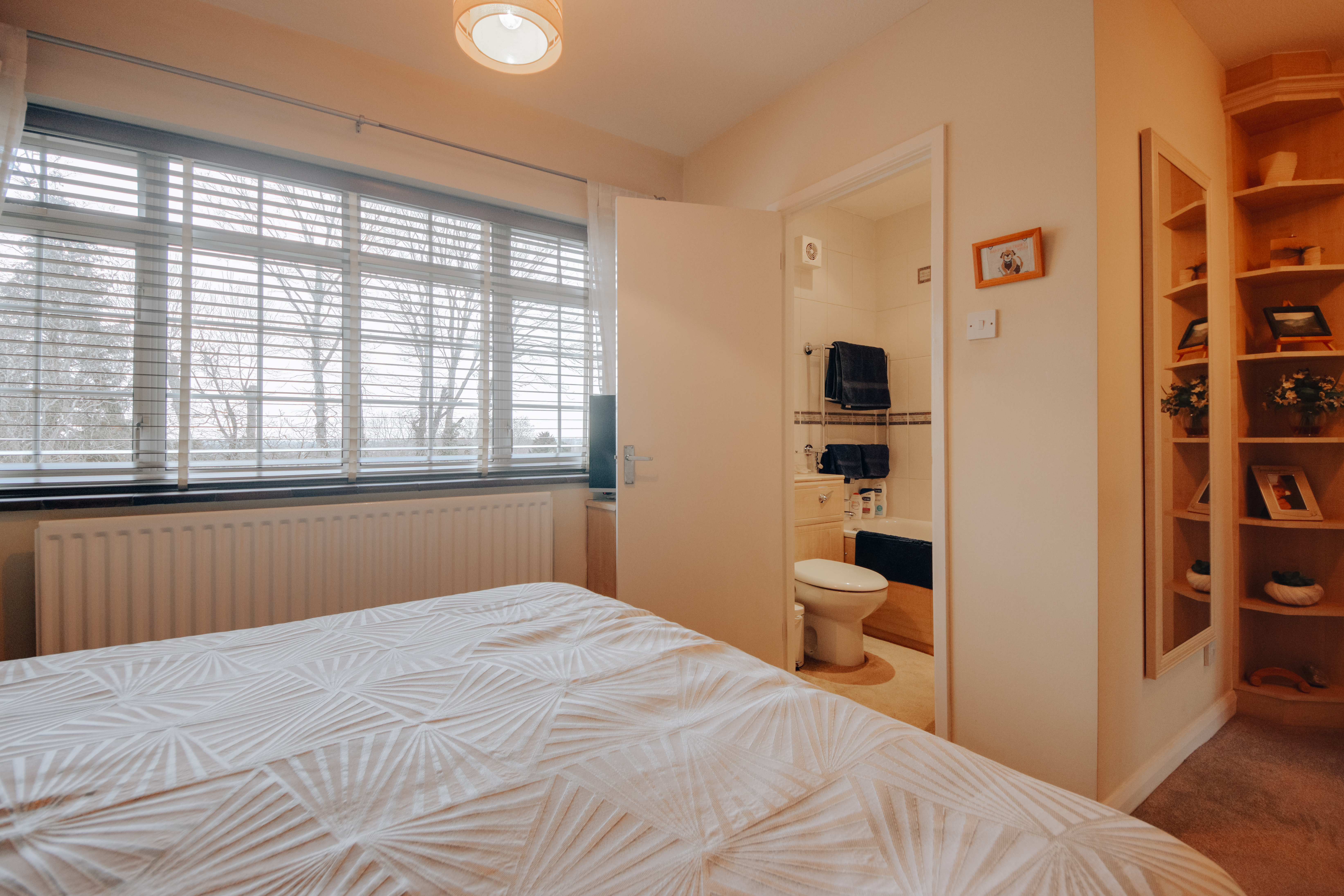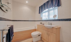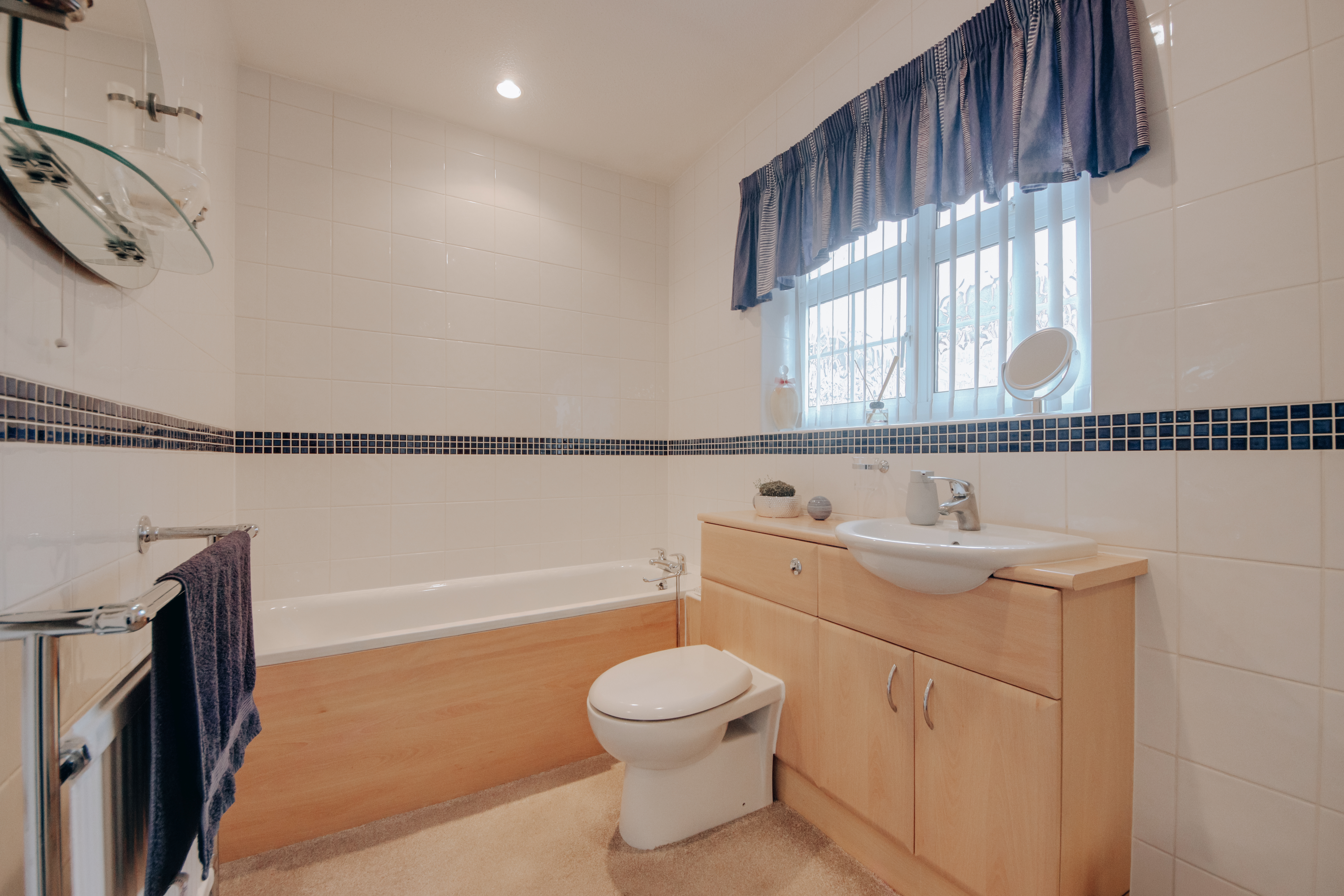 Upstairs, the sense of balance and proportion continues. The principal suite measures 12’10” x 15’1” and is complete with built-in cabinetry and a well-appointed en-suite bathroom. Three further bedrooms follow a cohesive design language, each offering generous proportions and practical, flexible layouts suited to family living. The family bathroom has been curated with the same level of care, featuring a bathtub set against crisp white tiling with a subtle blue feature band. By thoughtfully reclaiming space from a former landing cupboard, the current owners have introduced a separate walk-in shower enclosure. As with much of the house, there is scope for the next owners to introduce their own aesthetic over time. The considered decisions made throughout the current tenure ensure the home can be lived in and enjoyed immediately, while any future changes can be approached gradually and with confidence.