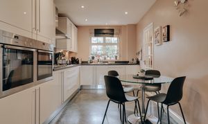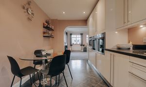 Stepping inside, a wide and welcoming hallway sets the tone, acting as the central axis from which each carefully considered space unfolds. Double doors ahead and a single door to the left lead through to a generous dual-aspect through-lounge measuring 22’4” x 24’1”, currently arranged as a more formal sitting room with space to dine. Original oak parquet flooring and a feature fireplace quietly honour the home’s heritage, lending warmth and a sense of timelessness throughout. The kitchen balances form and function with ease. Cabinetry wraps the space on a clean ninety-degree layout, while each appliance has been thoughtfully selected to elevate the everyday without excess. The ground floor is further enhanced by a second reception room, forming part of the later extension, alongside a practical utility room and shower room. A separate guest WC sits neatly off the hallway, completing a ground floor arrangement that is both versatile and well resolved.
