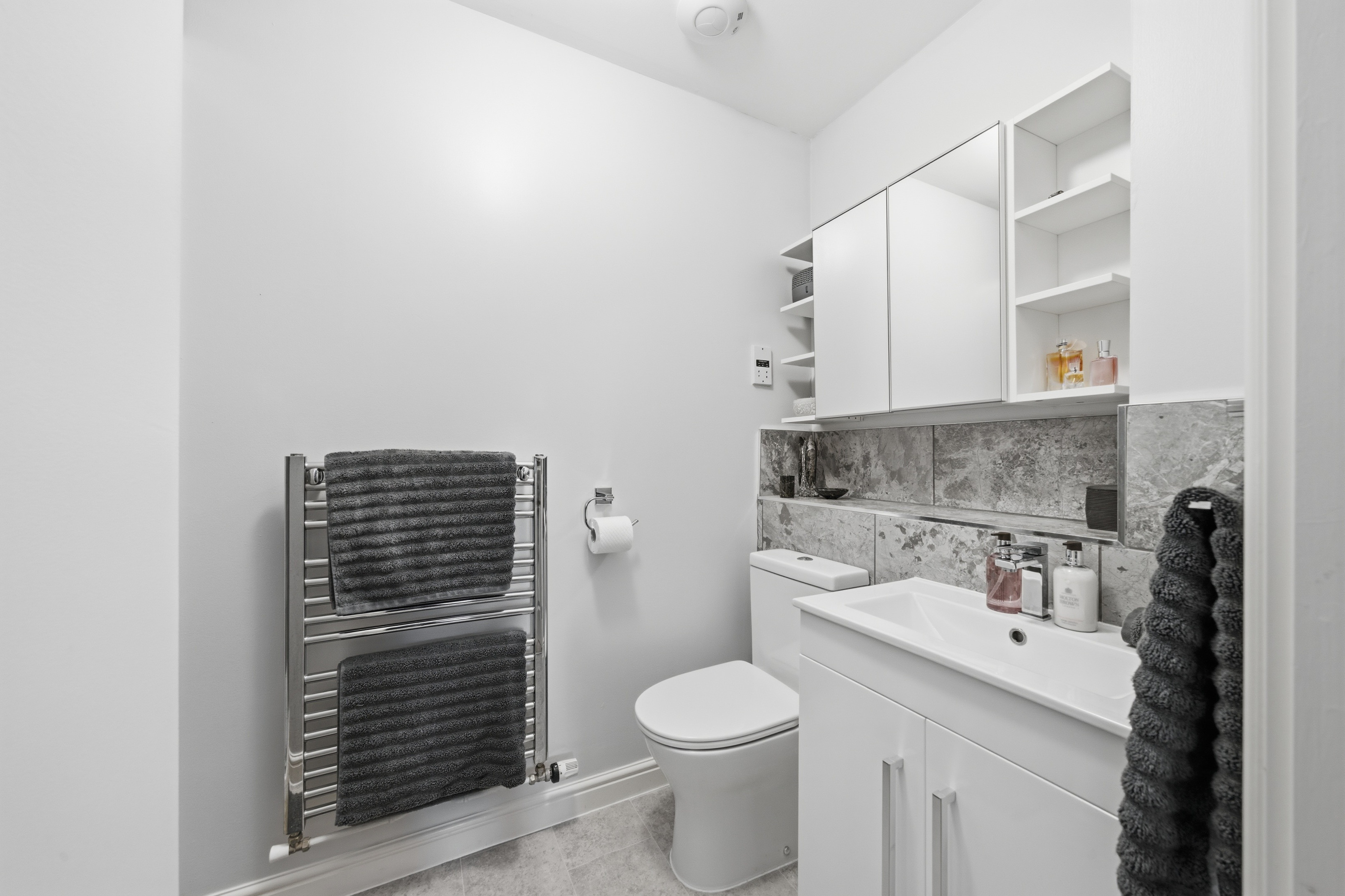 Upstairs, the first floor landing provides an airing cupboard and access to the loft space. The principal bedroom benefits from built-in wardrobes and a newly fitted ensuite shower room, featuring an oversized shower cubicle, vanity wash basin, WC, and fitted storage with shelving. Bedroom two is another comfortable double room, while bedroom three offers flexibility as a single bedroom, nursery or home office.