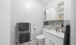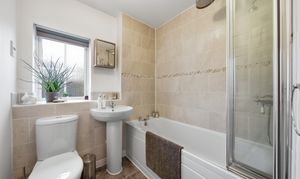 The refitted family bathroom is finished to a high standard, comprising a bath with both shower and rainfall attachments, wash basin, WC, and half-tiled walls.