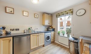 The ground floor accommodation begins with a welcoming entrance hall with stairs rising to the first floor and access to a convenient cloakroom. The kitchen/breakfast room is well-appointed with a range of fully fitted wall and base units, drawers beneath rolled-edge worktops, tiled splashbacks, and a stainless steel sink with mixer tap. Integrated appliances include an oven, hob and extractor hood, with further space provided for a fridge/freezer, washing machine and dishwasher.