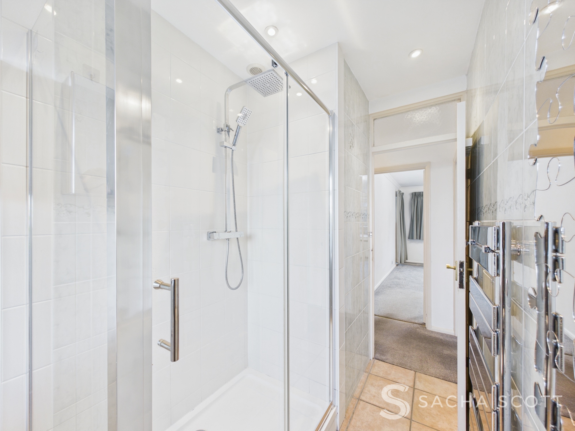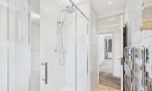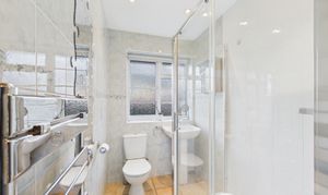 Fully tiled, this modern bathroom offers a large shower enclosure, WC, sink and heated towel rail.