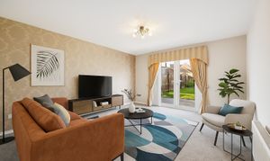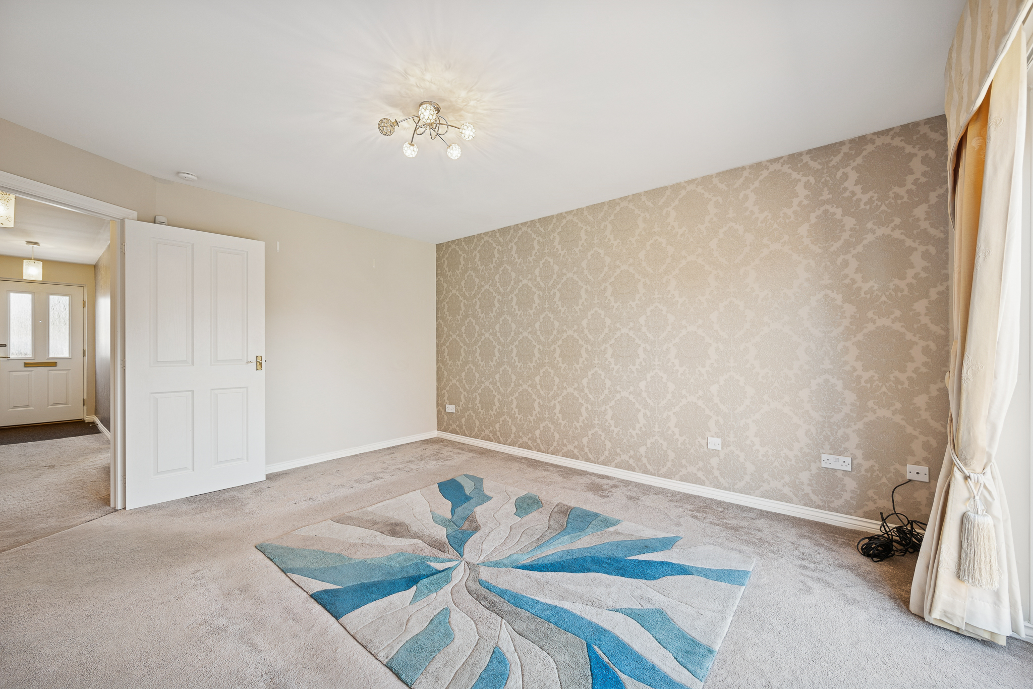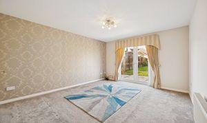 The lounge is an impressive yet inviting space, expansive enough to accommodate a variety of layouts while retaining a cosy atmosphere, finished with a wallpapered feature wall and French doors that open to the south-facing garden, flooding the room with natural light and creating an ideal setting for both everyday living and entertaining.