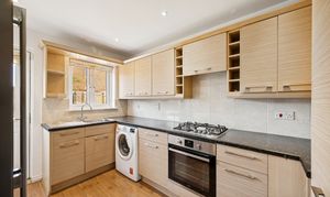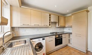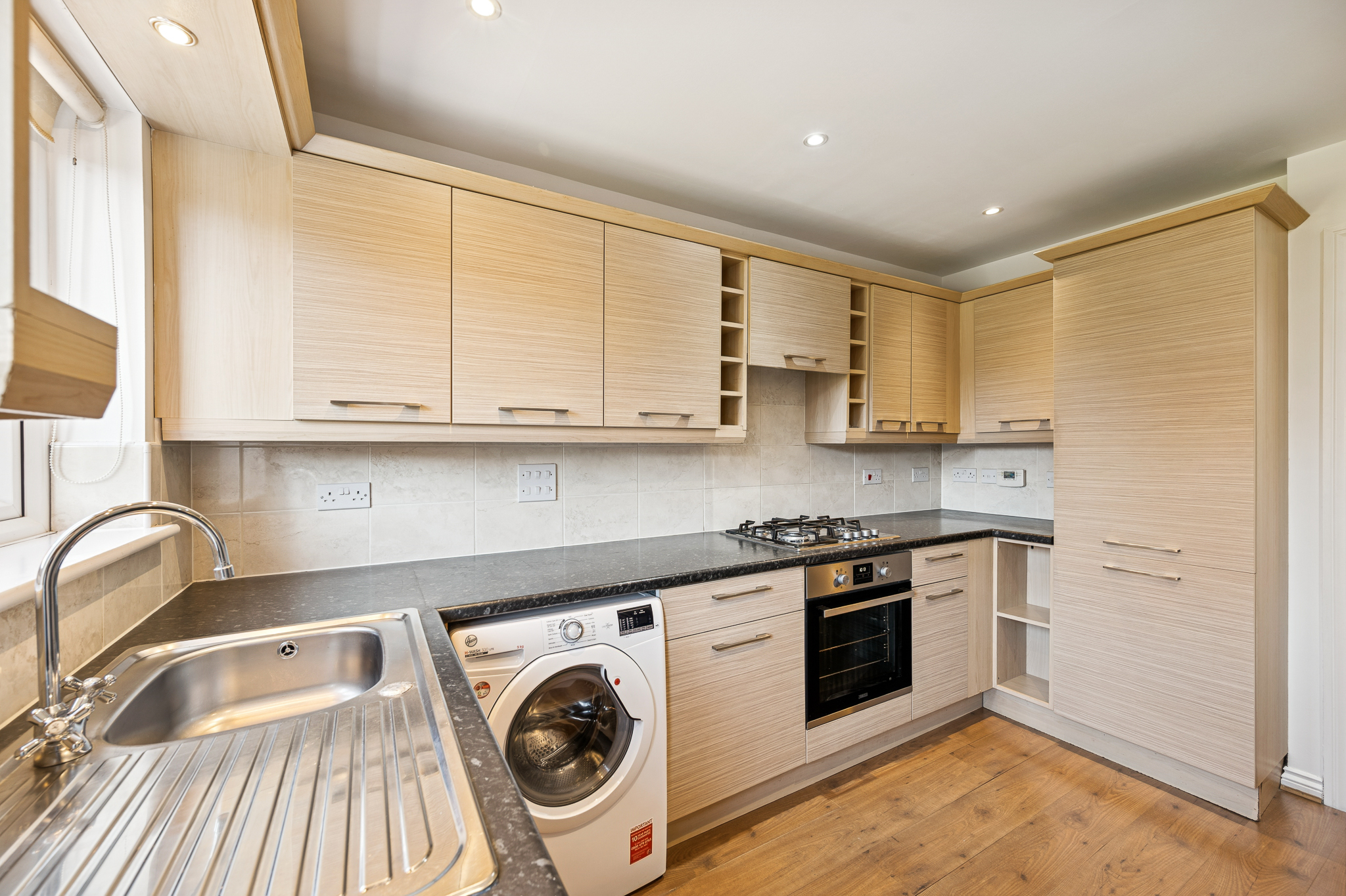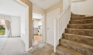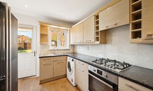 A bright and welcoming hallway sets the tone on entry, leading through to a contemporary kitchen that balances practicality with style, featuring excellent worktop space, generous fitted storage, a built-in oven and hob alongside integrated dishwasher and washing machine and provision for freestanding appliances, all complemented by pleasant views over the rear garden.