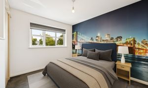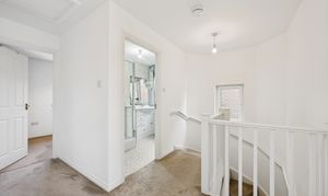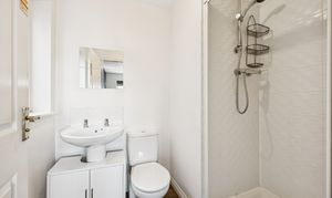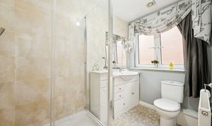 Upstairs, the home continues to impress with four generously sized double bedrooms, all designed to offer both comfort and practicality. The principal bedroom is the highlight retreat, easily accommodating a king-size bed while offering a wealth of built-in storage. It also benefits from a private en-suite shower room, styled in a neutral palette with partial tiling that lends a clean, contemporary feel. The en-suite includes a spacious shower enclosure and thoughtful neutral finishes that add a touch of understated luxury.