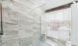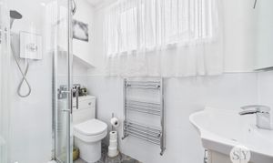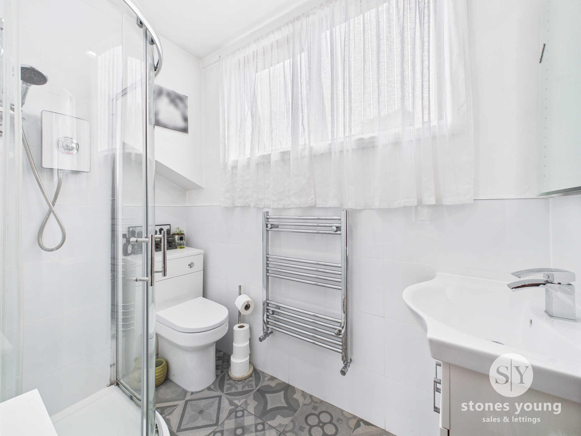 Four piece in white including walk-in shower enclosure with mains fed shower, Vanity unit housing sink and WC, tiled splashbacks, tiled flooring, heated towel radiator, uPVC double glazed window.