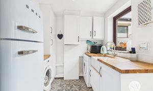 Wall and base units with contrasting work surfaces, Belfast sink, space gor fridge freezer, and dryer, plumbed for washing, cupboard housing boiler, uPVC double glazed window and door, tiled flooring.