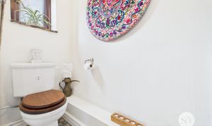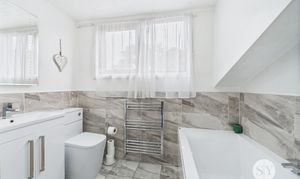 Two piece in white, tiled flooring, uPVC double glazed frosted window, panel radiator.