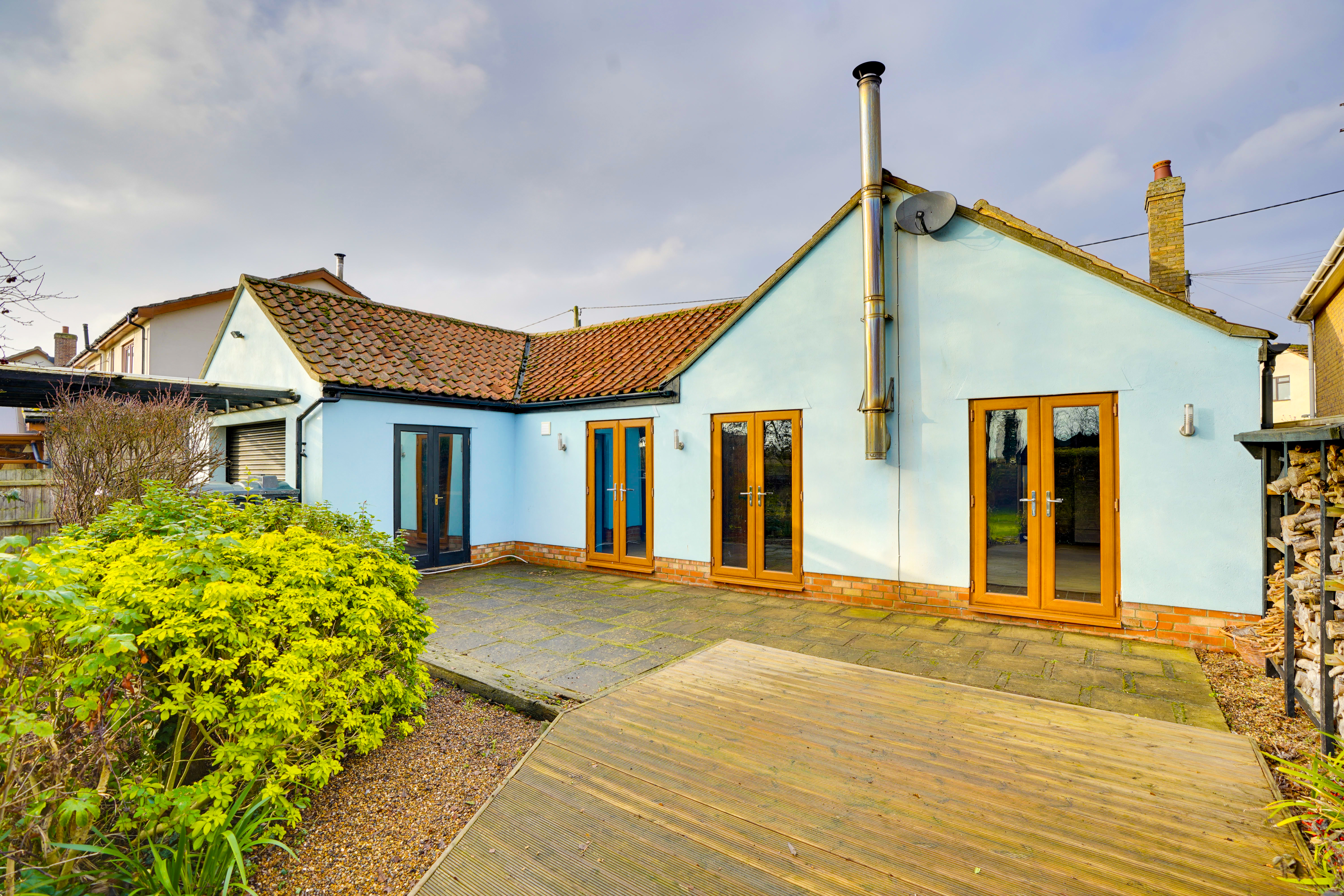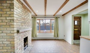 The living room forms the centrepiece of the home, featuring a striking brick fireplace as its focal point. Full of character, this room enjoys an abundance of natural light, with French doors on either side opening directly to the garden and enhancing the sense of space and connection to the outdoors.