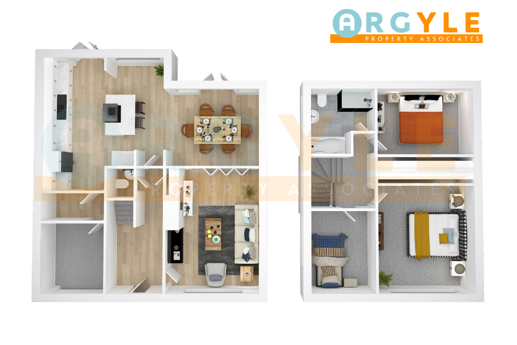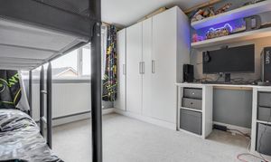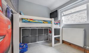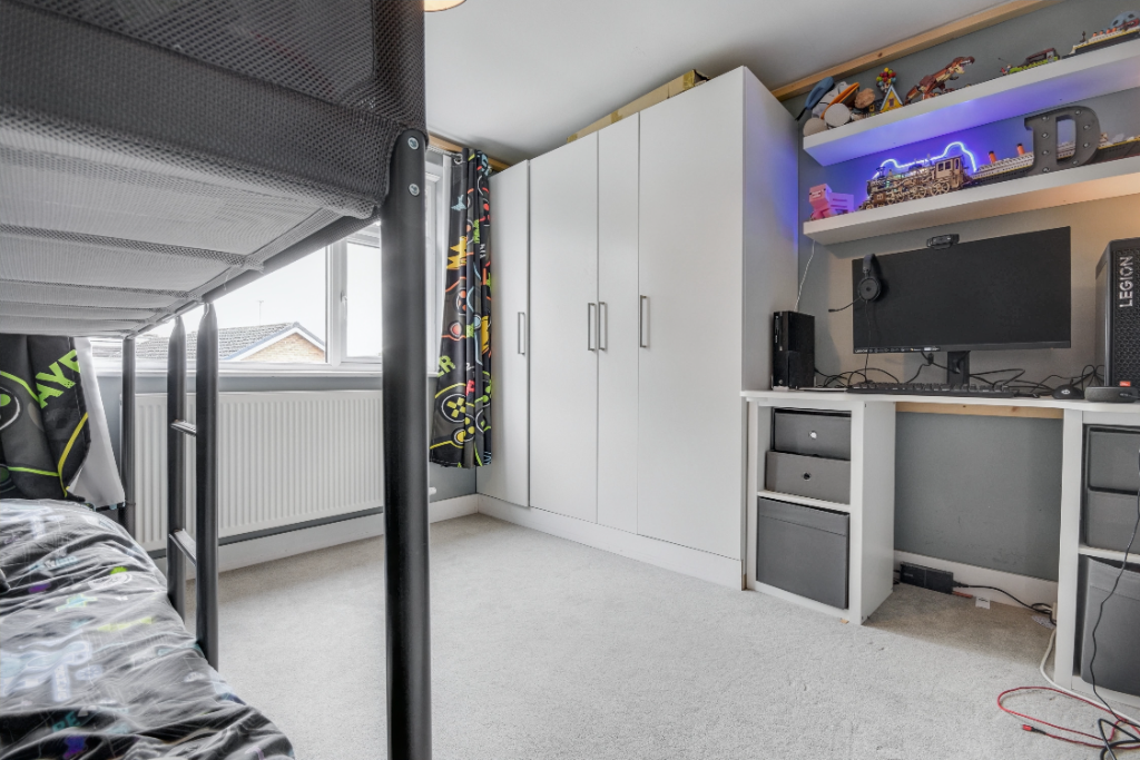 The second bedroom, at the rear of the property, is a good-sized double. Its existing orientation highlights the space, as the room easily accommodates a bunk bed, a wardrobe, and a desk, while leaving significant clear carpet space.