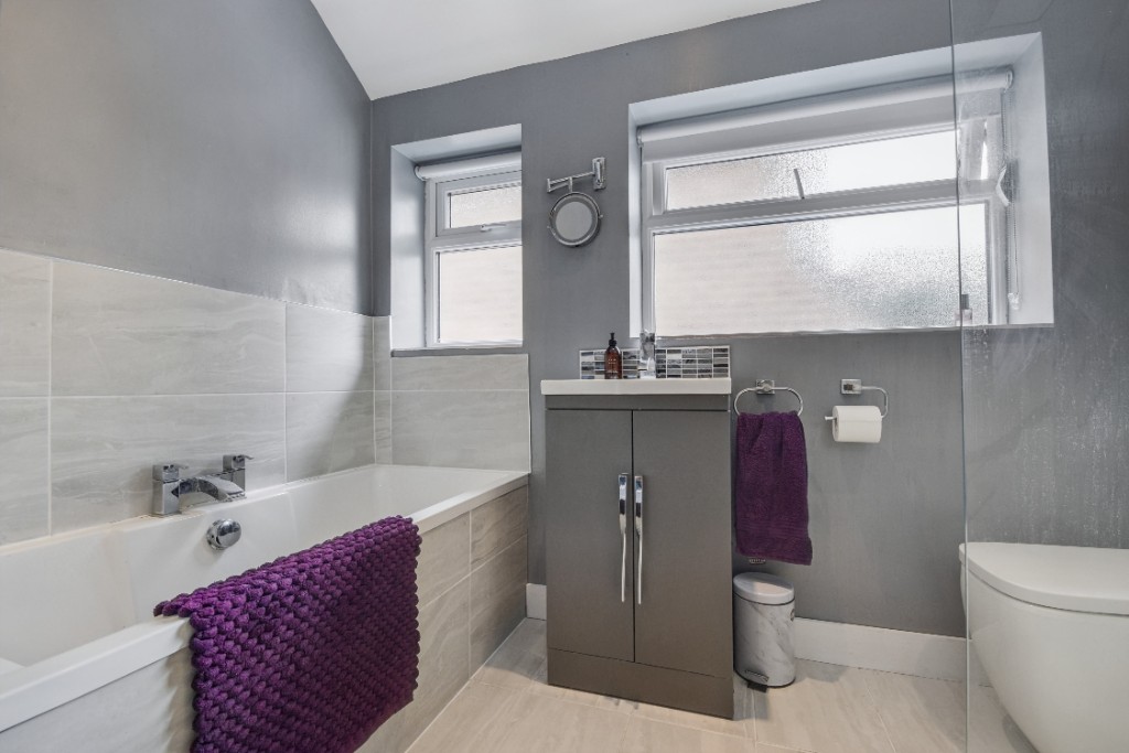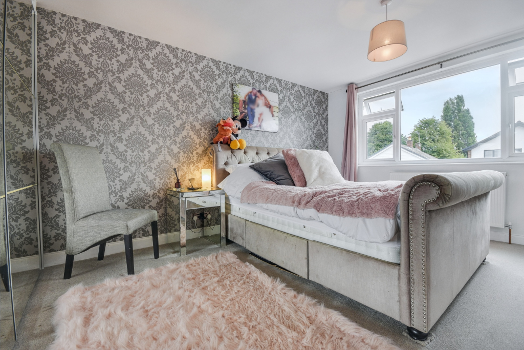 Upstairs, we find three good-sized bedrooms. The master bedroom is a spacious double room featuring wall-to-wall built-in mirrored wardrobes, which continue the theme of a clutter-free living space. The large UPVC double-glazed window looks out on the off-road driveway and gives this room a bright and airy feel. The second bedroom is a good-sized double, looking out over the private garden, whilst the third bedroom - currently used as a child’s room - could be used as a nursery, office or small guest room.