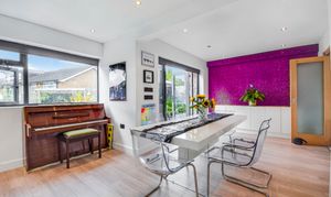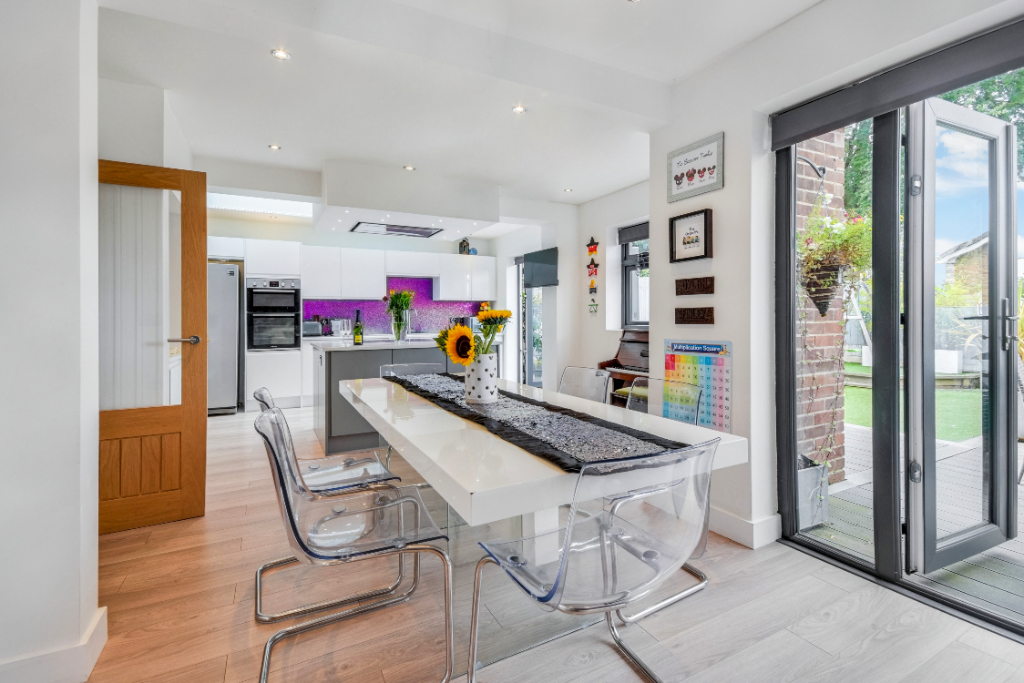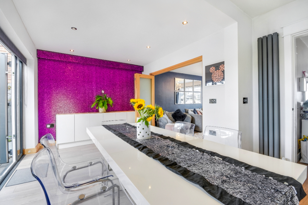 A large dining room with open plan access to the kitchen, internal concertina doors through to the living room and patio doors to the back garden. This fully modernised space makes for an exceptional place to entertain friends and family throughout the year.