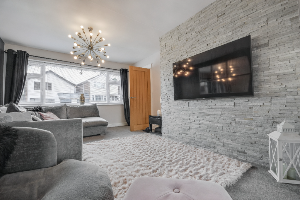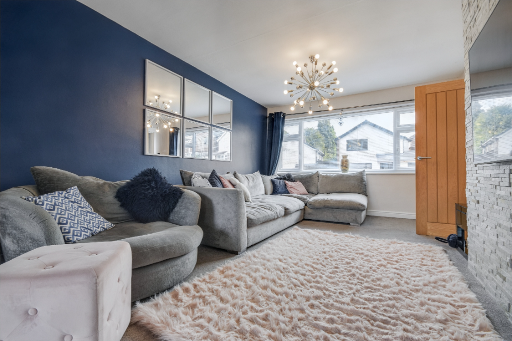 The ultimate family room to while away the dark evenings in a relaxed, cosy space. A midnight blue feature wall perfectly balances its grey stone effect counterpart, whilst the large UPVC double-glazed windows keep the room bright and airy during the daylight hours.