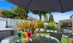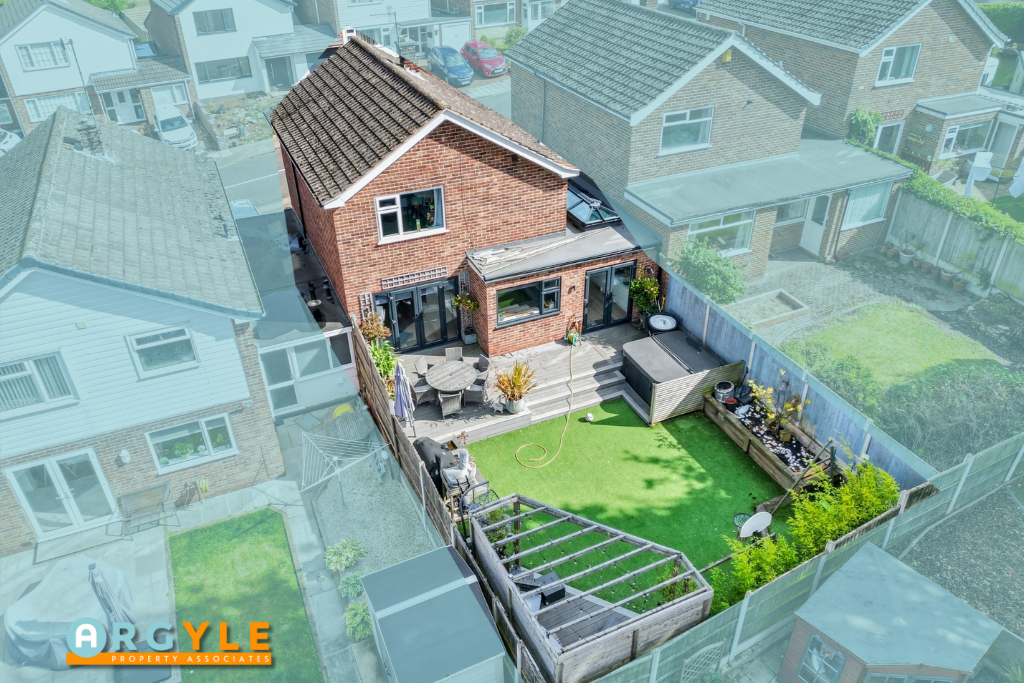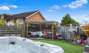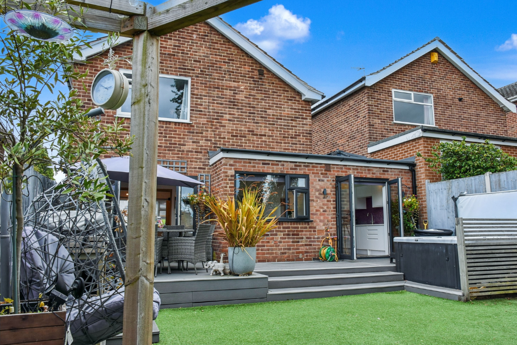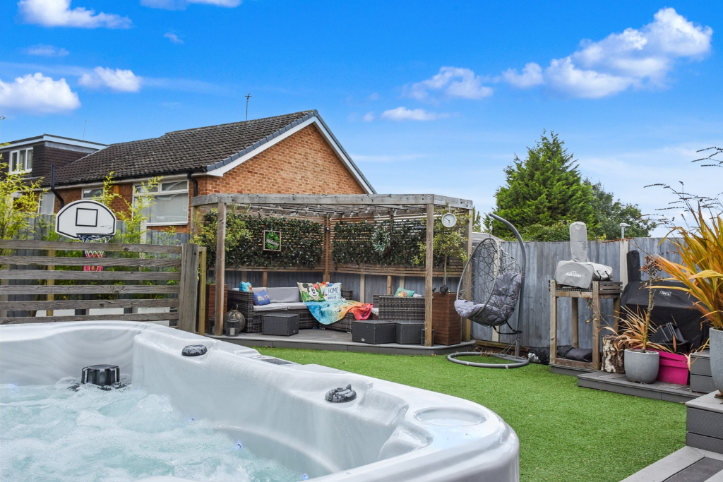 A large garden to the rear of the property featuring artificial turf, a large decked area, a second decked seating area, and space for a hot tub. The garden provides a natural, resort-like feel that can be easily maintained and managed throughout all seasons of the year.
