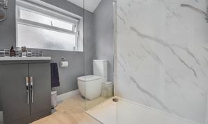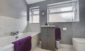 A modern family bathroom benefitting from a full-sized bath, double shower, vanity sink unit and toilet. Tiled with a light grey floor tile, complementing the tasteful decor of this exceptional family home.