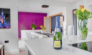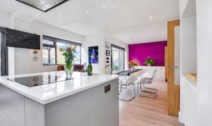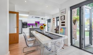Having parked your car on the off-road driveway, you enter the property through a spacious entrance hallway. A thoughtfully placed cupboard keeps shoes and coats out of the way as you make your way through to the extended open-plan living area. To the left is the kitchen, which is laden with countless cupboards keeping you tidy and free of clutter. The sky lantern enhances the fresh and airy feeling of this modern kitchen, whilst the large island cleverly partitions the dining area, which is found to the right.