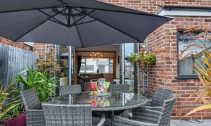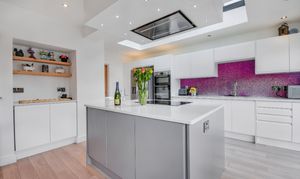 A stylish modern kitchen is flooded with natural light owing to the roof lantern and UPVC garden doors. The large kitchen island houses the electric hob, which is complemented by the discreet overhead extractor fan. Benefitting from more cupboard space than average, it is easy to keep this elegant space clutter-free and to enjoy its sleek design.