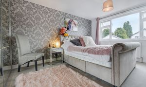 A large double bedroom benefiting from wall-to-wall built-in storage cupboards. Neutrally decorated with light greys, plush carpet and a fresh white ceiling.